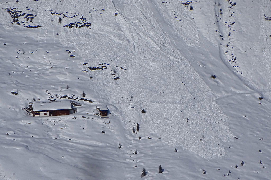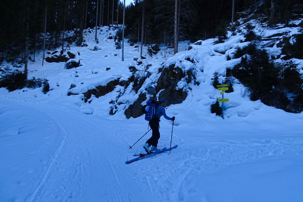 Zu großen Teilen folgen wir der Aufstiegsspur, vor dem Rücken, der uns zum Grat geführt hat, entscheiden wir uns allerdings für eine Abfahrt in den breiten Hang hinein. Es bieten sich einige Varianten an, auch nördlich durch den Wald. Allerdings sollte man sich auf den vielen Forststraßen später nicht verirren.