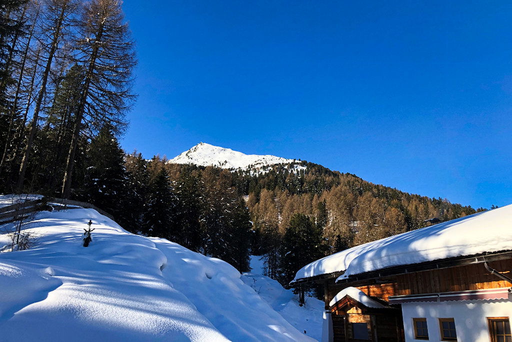 Bei der Busfahrt erspähen wir einen kleinen Übungslift in Milders. Abseits der Erinnerungen an eine schneereichere Kindheit in den oberösterreichischen Voralpen, wo man auch noch auf kleinen Einzelliften das Skifahren lernen konnte, kommt die Idee auf, entlang der Piste den Aufstieg zu beginnen. Alternativ könnte man Richtung Oberbergtal nach Norden gehen, von der asphaltierten Straße biegt nach der Siedlung bald eine wiederum asphaltierte Straße links den Berg hinauf ab. In der ersten Kehre dieser Straße beginnt die Rodelbahn der Milderaunalm.