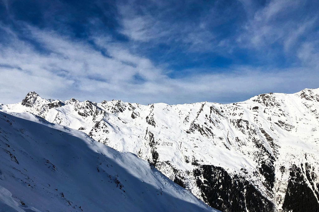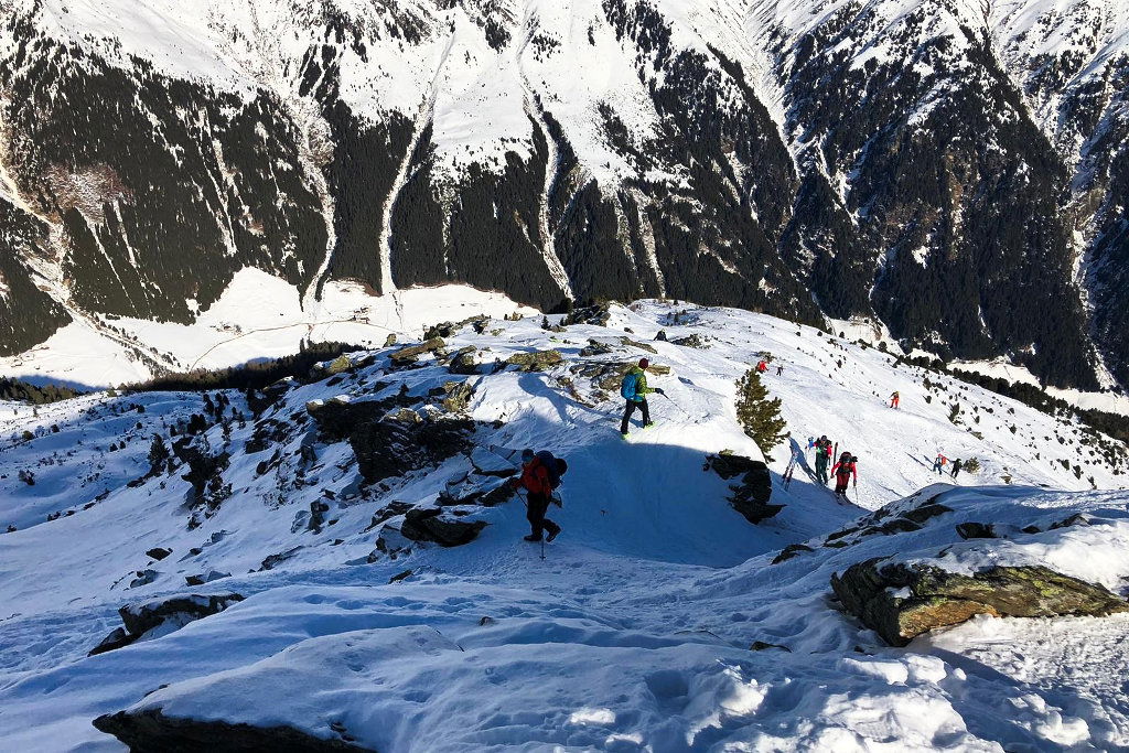 Der uns zugewandte Rücken bietet sich herrlich an, um auf den Grat aufzusteigen. Zwar sind vereinzelt Spitzkehren schon angebracht, die Neigung ist aber angenehm. So bleibt genug Kraft, um auch zu quatschen und das sich immer weiter öffnende Panorama zu genießen! Der Grat ist breit und lässt sich genüsslich bestreiten – wenn man sich vom Wind nicht die Stimmung vermiesen lässt.