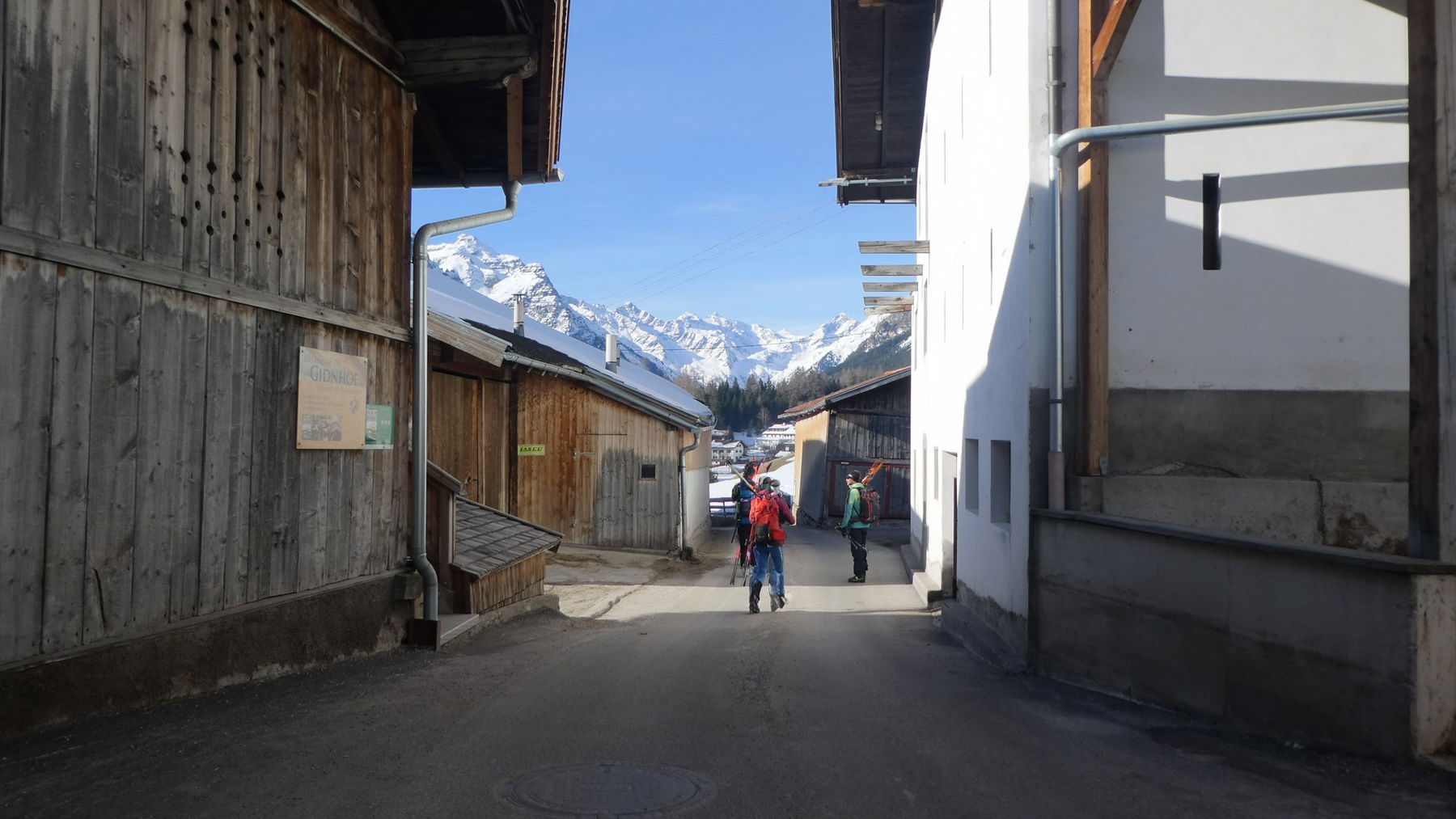 Im Bus 4146 nach Trins reisen u.a. auch Langlaufskier in Vierbeiner-Begleitung mit. Die Haltestelle „Trins Gemeindeamt“, die uns noch von unserem gestrigen Laufschritt kennt, können wir heute gemächlich durch den Ort Richtung Talboden verlassen.