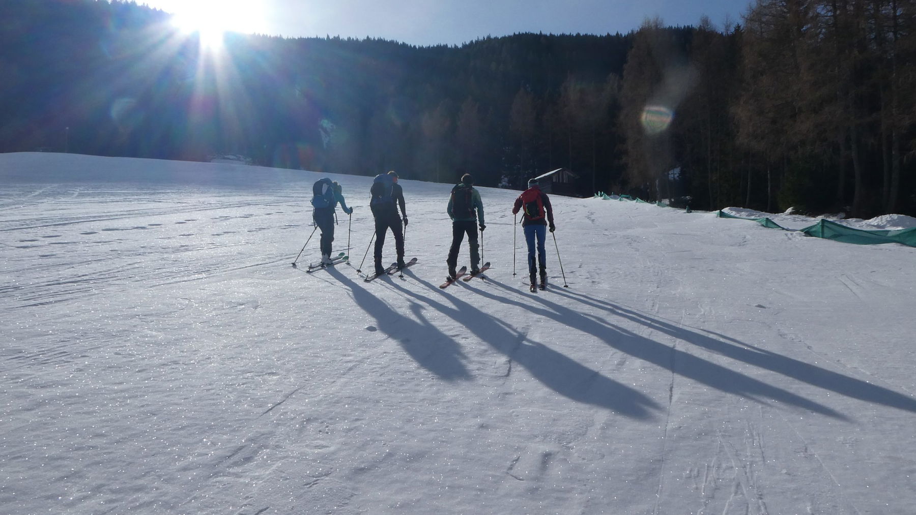 Bei einem kleinen Skilift schnallen wir an. Es braucht lange, bis das Knirschen des Schnees, der „Gesang“ der Felle auf dem windverzierten Harsch und das aufgeregte Gezwitscher der Vögel die Beschallung, die aus dem Lifthäuschen kommt, überwiegt. Auf flachen Wiesen geht es an den Waldrand.
