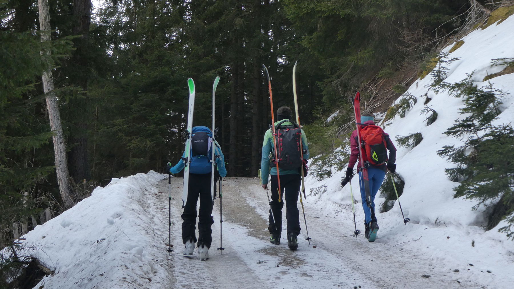 Thomas, unser heutiger Führer, hat gestern noch den besten Weg ausgekundschaftet. „Wenn ich mit einer schwächeren Gruppe unterwegs bin, gehe ich gleich auf der Forststraße“, sagt er, als wir, Spitzkehre für Spitzkehre zwischen dicht stehenden Bäumen an Höhe gewinnen, einen Stacheldrahtzaun an passender Stelle überwinden und schließlich am aperen Weg die Skier schultern.