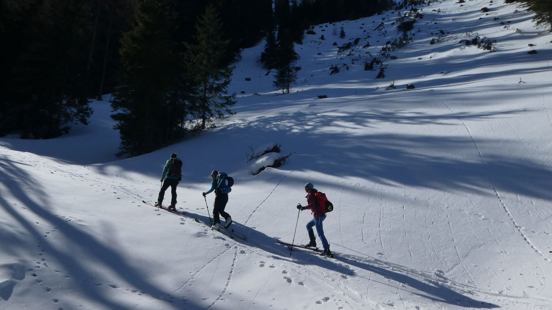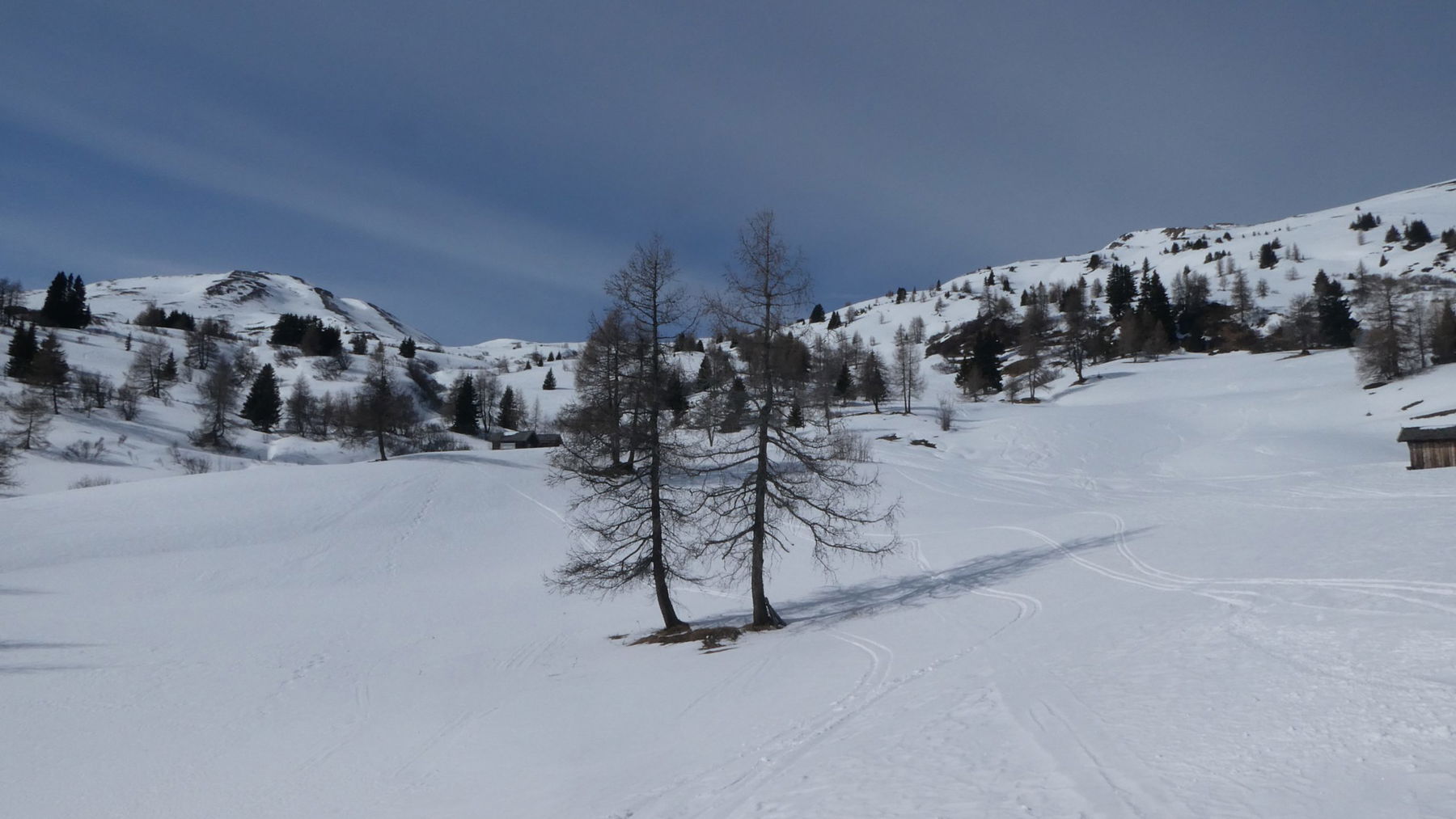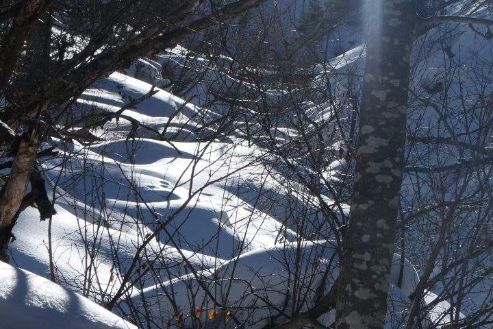 Bald kommen wir in einen Graben, der wiederum saubere Spitzkehren erfordert. Sonne und Schatten spielen mit dem welligen Gelände. Die Gespräche verstummen. Jede/r kann seinen eigenen Gedanken nachhängen. Die mächtigen Lärchen, die seit Jahrhunderten treu ihren Platz einnehmen, rücken die Zeithorizonte des eigenen Lebens zurecht…