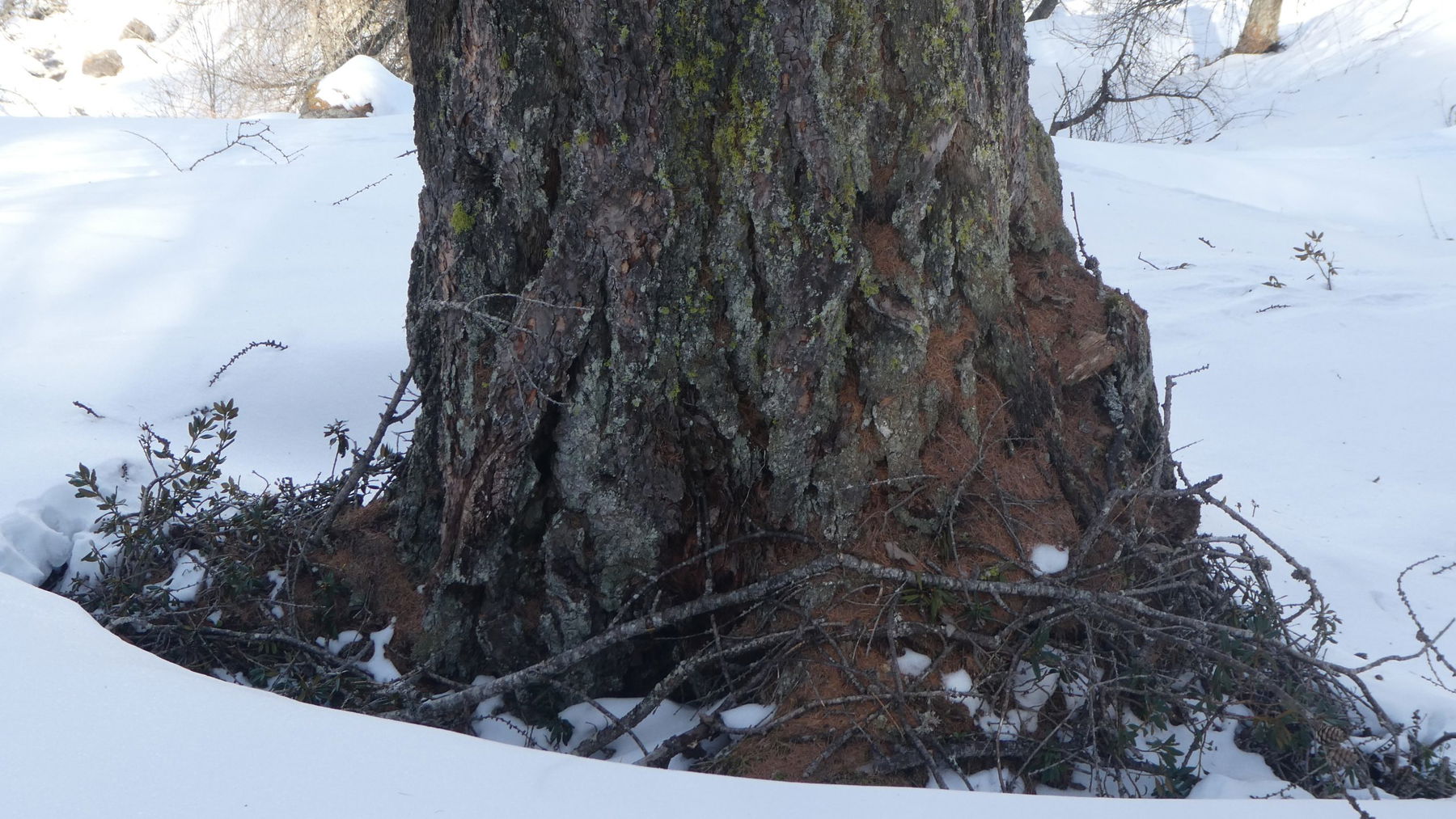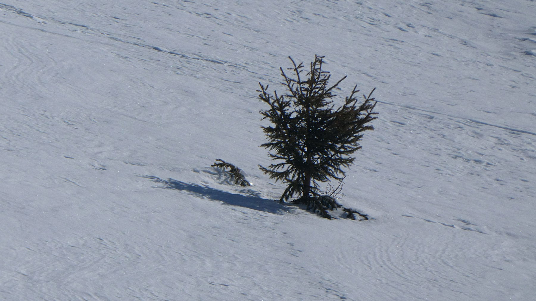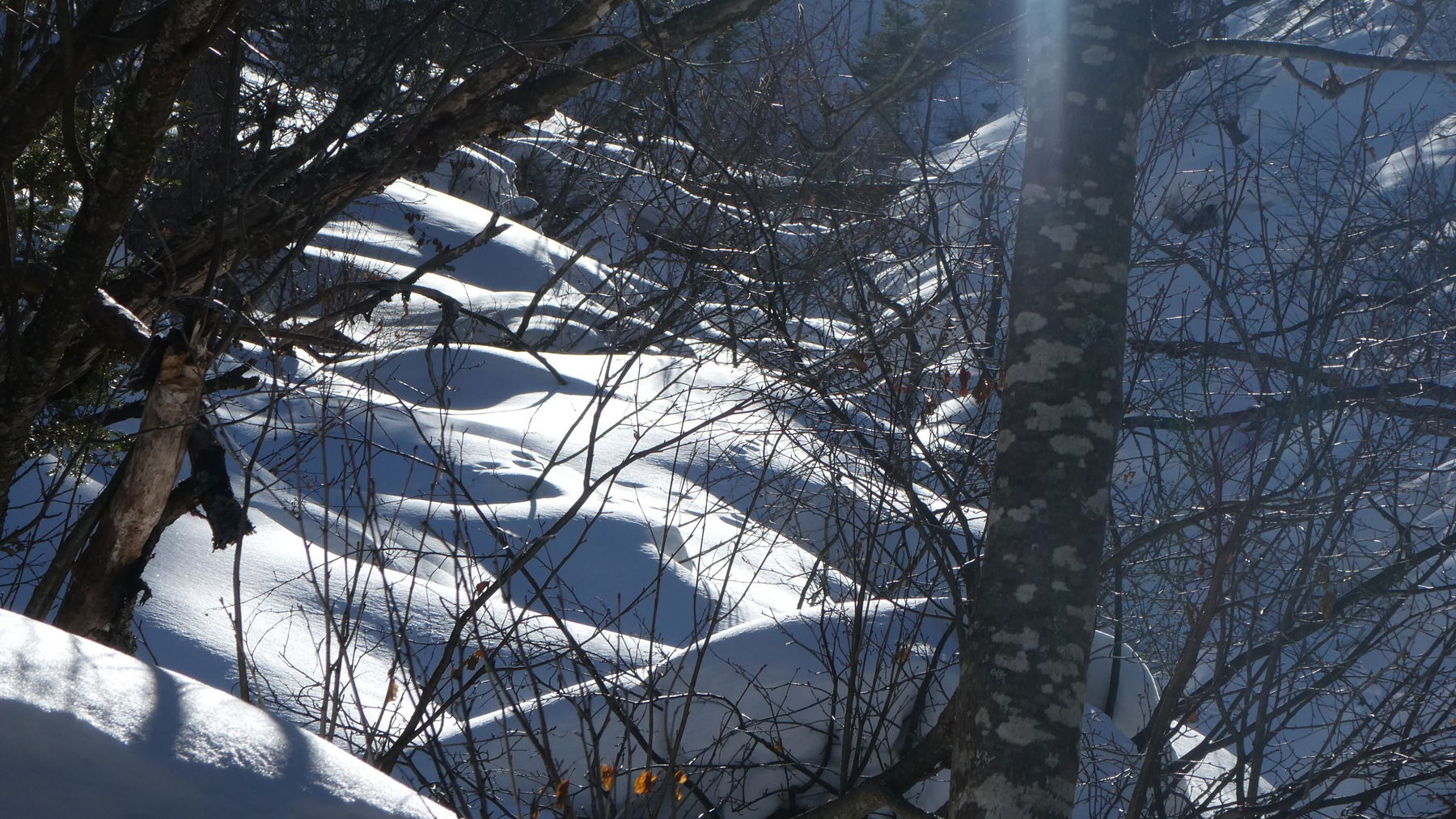 Bald kommen wir in einen Graben, der wiederum saubere Spitzkehren erfordert. Sonne und Schatten spielen mit dem welligen Gelände. Die Gespräche verstummen. Jede/r kann seinen eigenen Gedanken nachhängen. Die mächtigen Lärchen, die seit Jahrhunderten treu ihren Platz einnehmen, rücken die Zeithorizonte des eigenen Lebens zurecht…