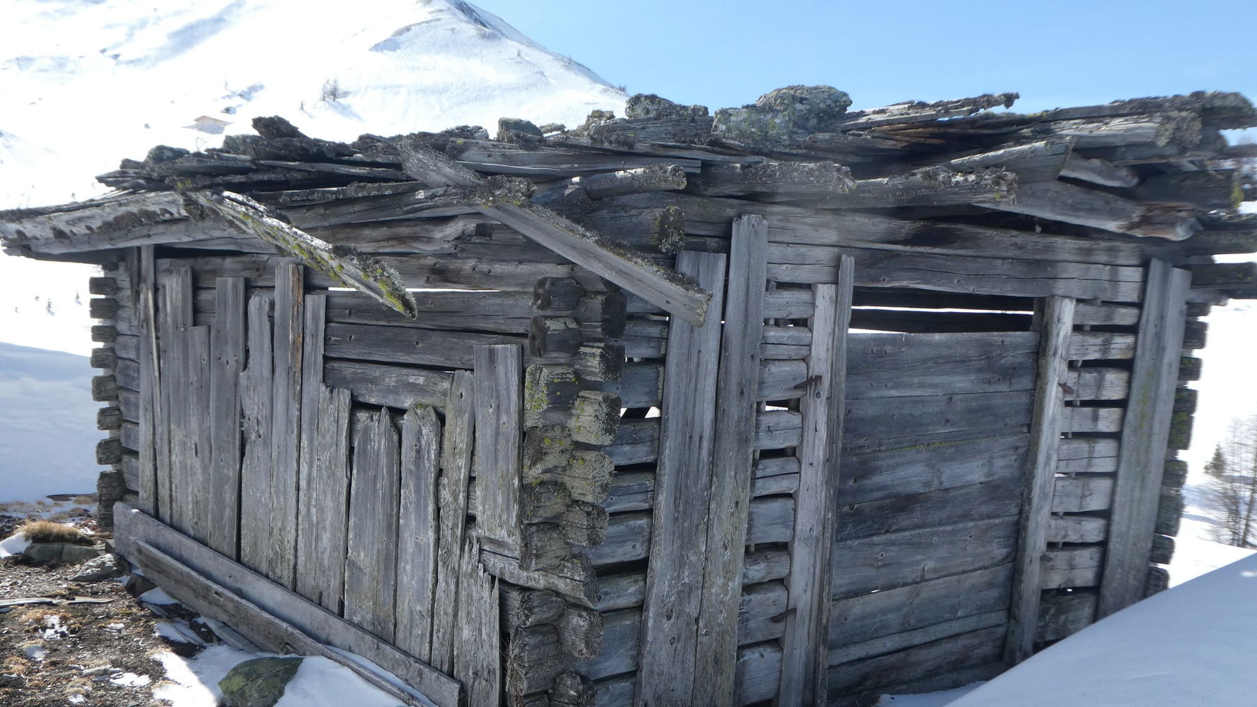 Unversehens unterhalte ich mich mit einer in die Jahre gekommenen Heuhütte. Sie stammt aus einer anderen Zeit, in der Balken nicht mit Nägeln, sondern mit langen Holzdübeln (ist das der korrekte Ausdruck?) verbunden wurden, um die Öffnung für die rahmenden Latten, zwischen die Bretter als „Tür“ geschoben werden können, zu stabilisieren. Stürme haben begonnen, die mit Steinen beschwerten Schindeln zu zerzausen. Flechten bevölkern die Stirnseite des Holzes. Die Hütte wird offenbar nicht mehr gebraucht, gehört zum „alten Eisen“. In ein paar Jahren wird das Dach einstürzen. Ein wirrer Haufen von dahinmodernden Balken wird noch viele Jahre dem, der es hören möchte, von längst vergangenen Mühen und Freuden erzählen… Warum trete ich an einem sonnigen Tag in solche Gespräche ein? Weil heute Aschermittwoch ist?