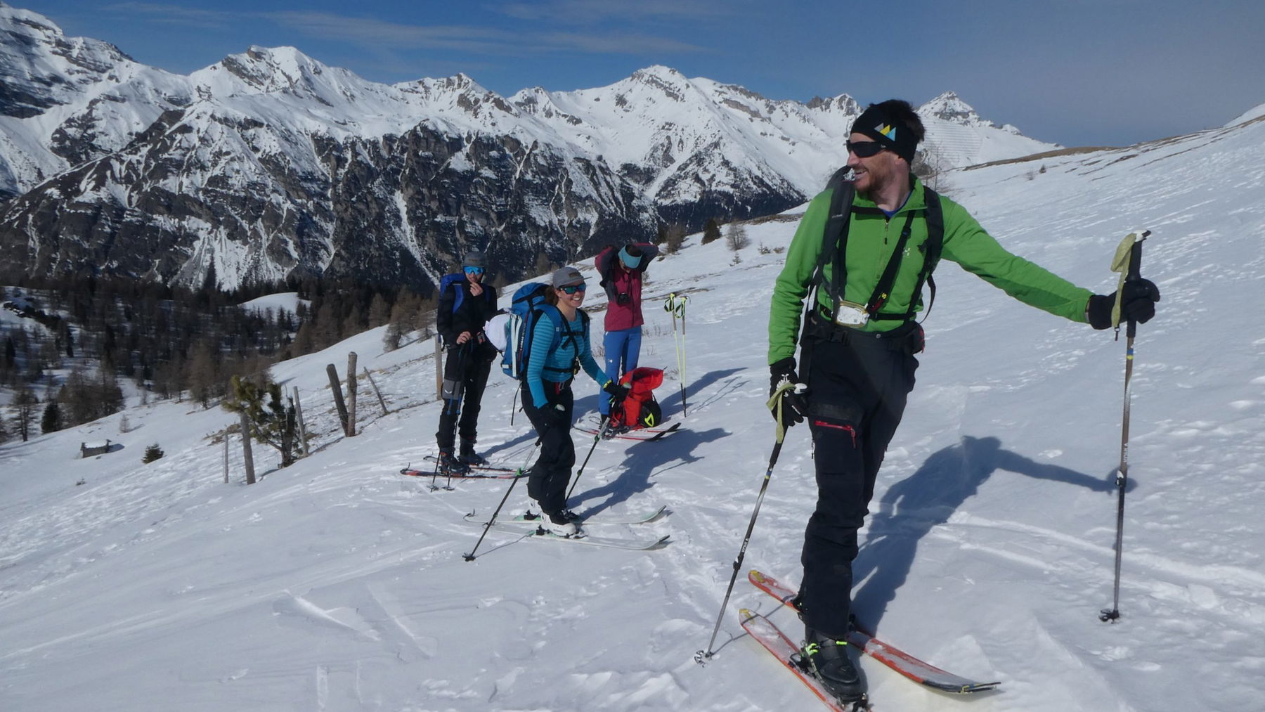 Ohne Rast, nach der obligaten „Umrüst-Pause“ (Felle und Tourenschuhe müssen sich in den Abfahrtsmodus begeben) geht es talwärts. Bei 20 cm Pulver oder bei Firn wäre dies ein Schwingen ohne Ende in angenehm geneigtem, prachtvollem Skigelände.