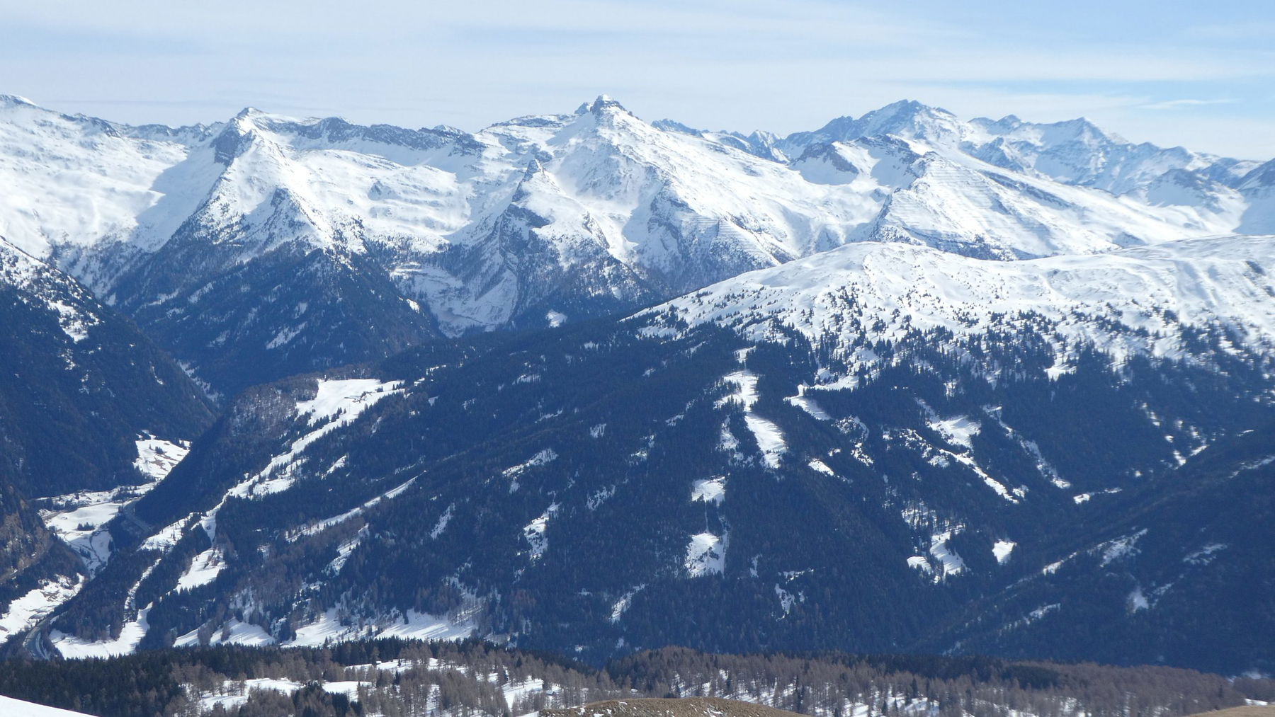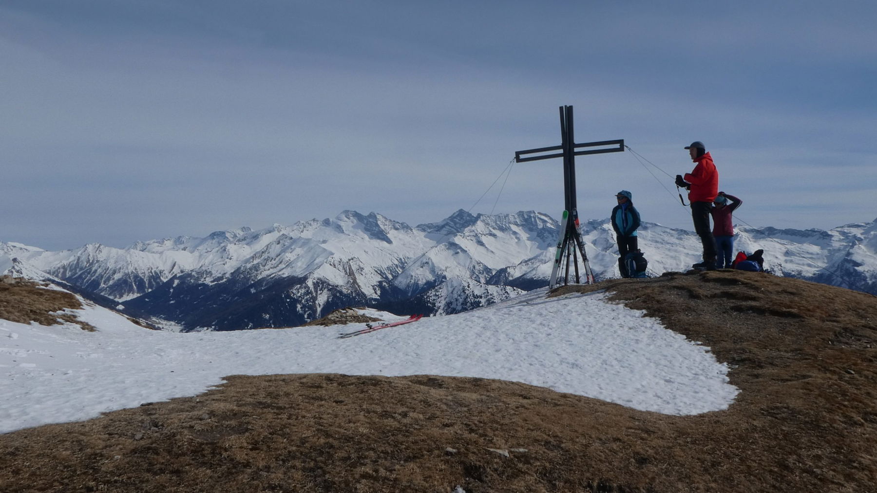 Wir schauen in die Runde: Die Winterdurchquerung liegt vor und hinter uns: dort die Serles mit der Kesselspitze, und hier der morgige Sattelberg. „Hinter dem Sattelberg die Lawinenverbauungen schützen den Brenner, und der flache Gipfel links daneben ist die Flatschspitze (2566m), der Gipfel für den Freitag“, erklärt uns Thomas.