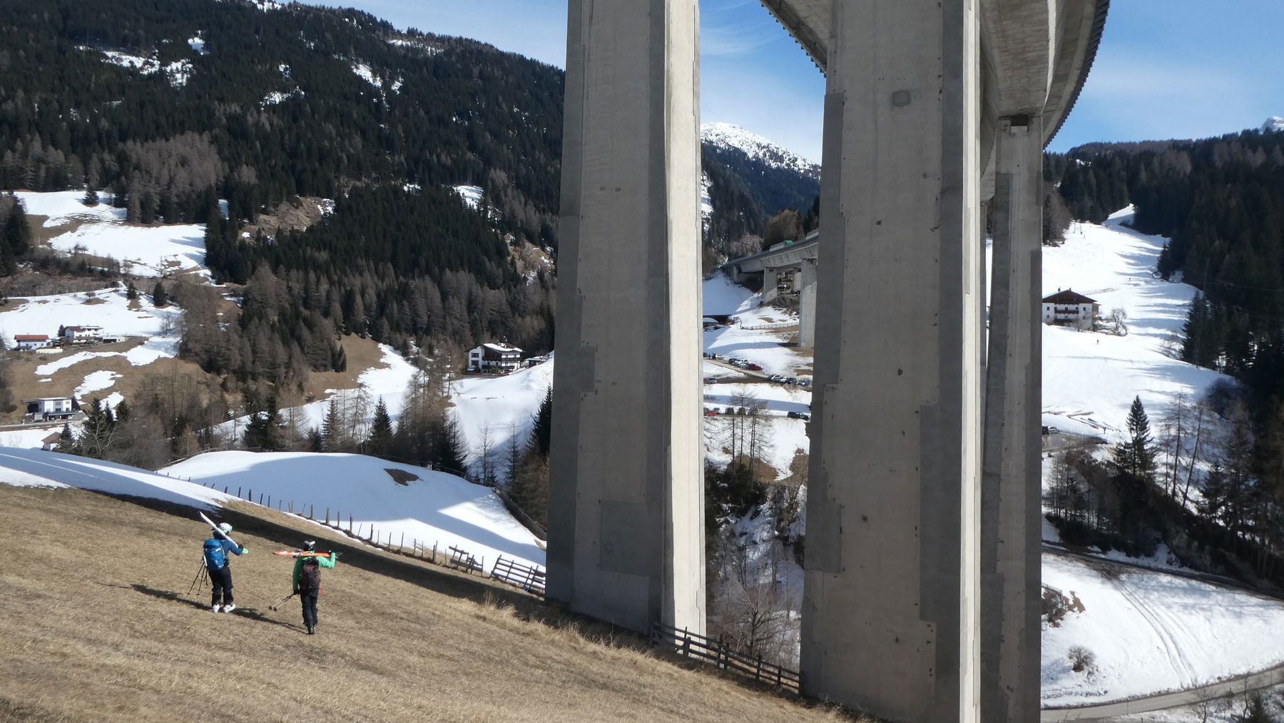 Auch wir erwischen noch die eine oder andere feine Mulde – und gegen das Tal zu beginnt es aufzufirnen, bis wir zu guter Letzt die steile Wiese unter einer der eindrucksvollen Brückenkonstruktion der A13, die eben auch als Wahrzeichen des Wipptals bezeichnet werden müsste, zu Fuß hinunterstapfen.