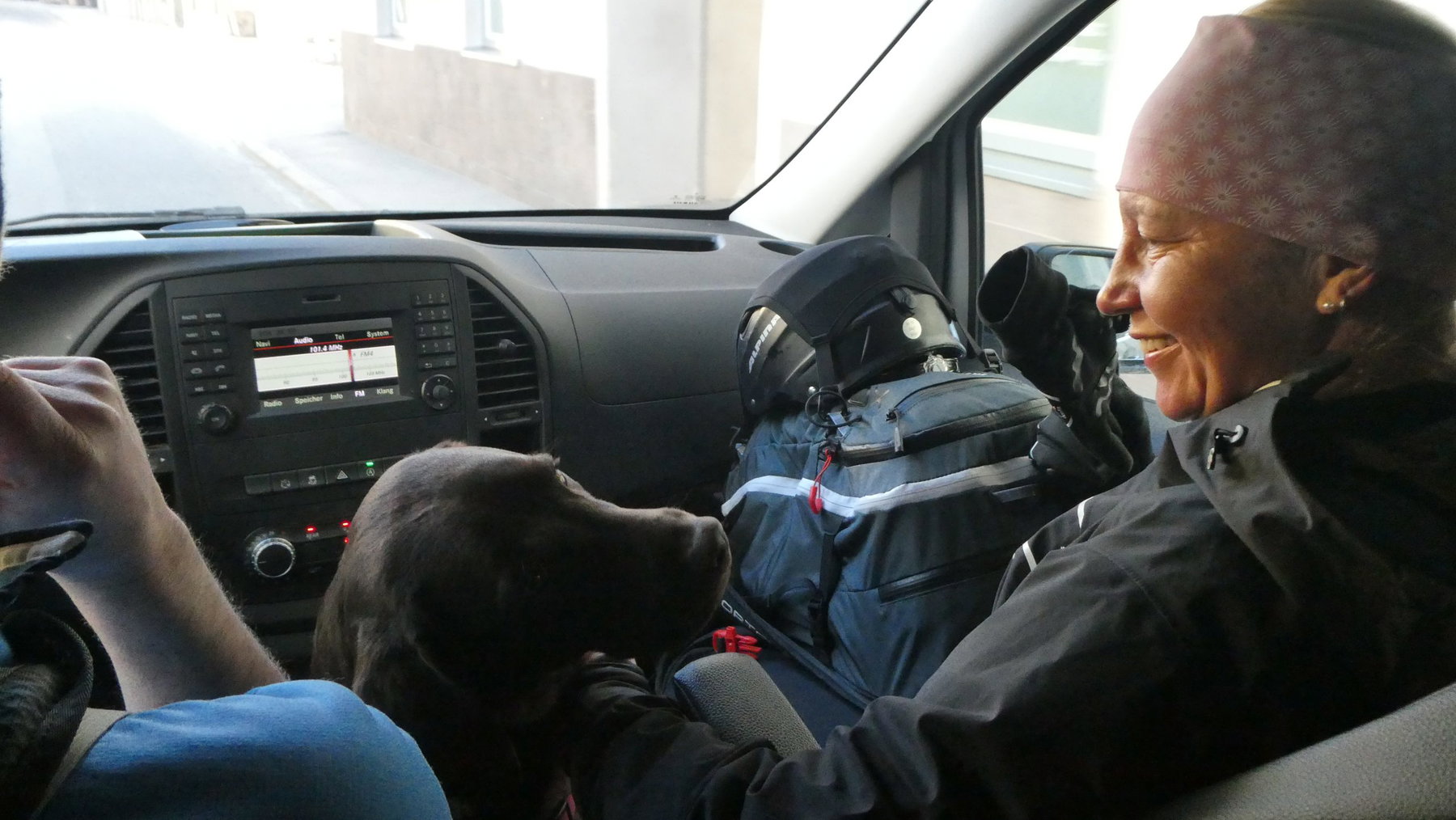 Unser Taxi ist heute bis auf den letzten Platz besetzt, wenn wir Florians Hündin Emma, die sich über Nicole freut (und umgekehrt, oder?) dazuzählen.