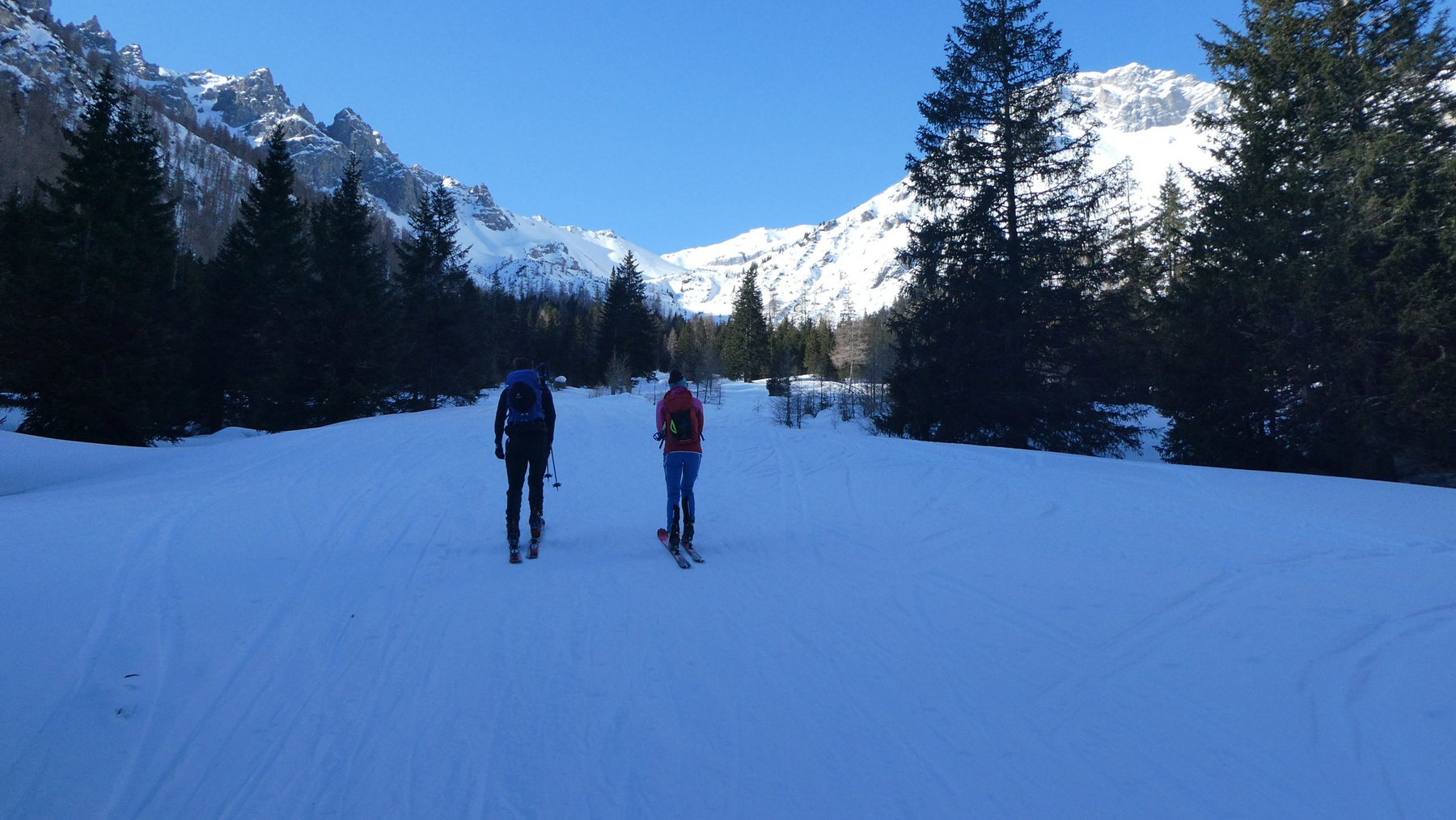 Strahlend blauer Himmel, Freude auf das Kommende und eisige Kälte im Schatten des noch jungen Tages. Susanne gibt den Schritt vor. Thomas fragt nach 10 Minuten auf sensible Weise, ob „dieses Tempo eh für die ganze Gruppe passt“. Da ich vergangene Woche schon vier Touren machen konnte, fällt mir das „Ja“ leicht(er).