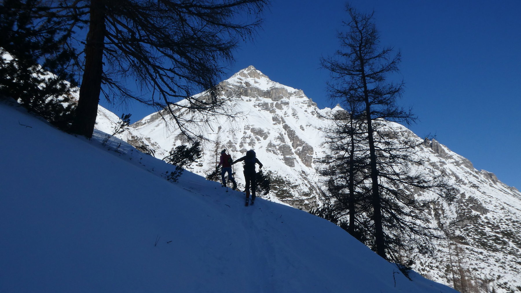 Es ist immer noch kalt, trotz der raschen Schritte. Die ostseitigen Hänge der Serles – nicht so markant wie die gestrige Nordansicht – gleißen im Sonnenlicht und geben eine perfekte Leinwand ab für Fotos, die an Scherenschnitte erinnern.