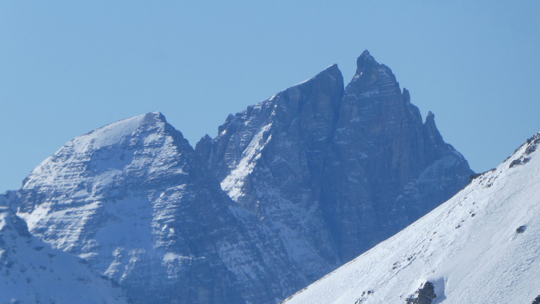 Der Gipfel ist erreicht. Es ist 12:30 Uhr. 1500 Hm in etwas mehr als drei Stunden, plus 300 Hm Abfahrt. Unsere Aufmerksamkeit wendet sich der Aussicht unter dem nach wie vor wolkenlosen Himmel zu.