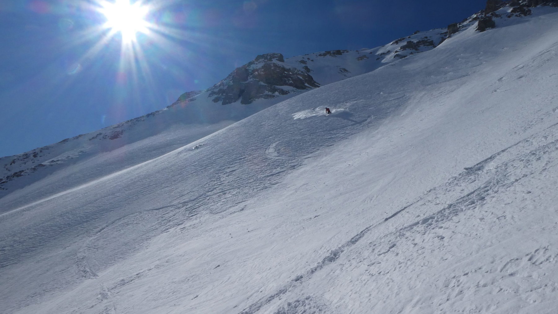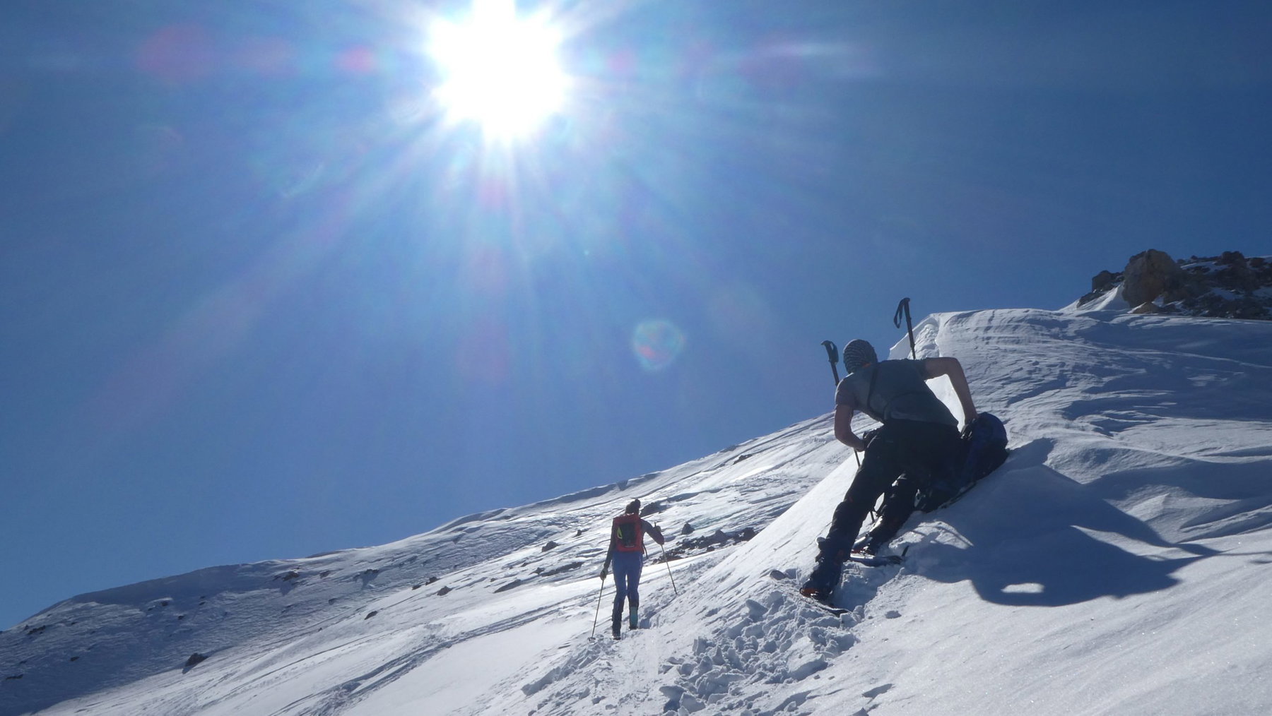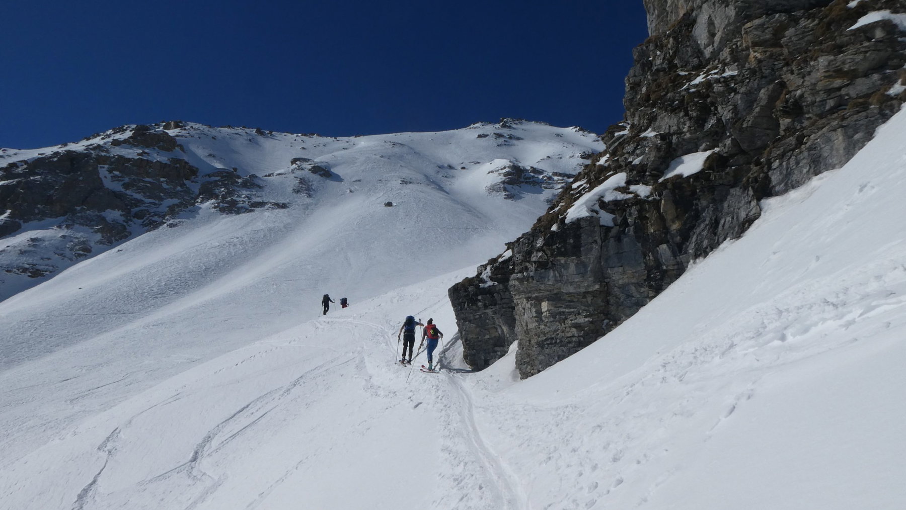 Nach zügigen 300 Hm: anfellen. Wir folgen der guten Trasse in das mächtige, den Gipfelgrat mit zwei Steilstufen verteidigende Kar. Die Sonne hat nun gänzlich die Regie übernommen und die angenehme Windstille und die gelegentliche Stollenbildung machen den Aufstieg schweißtreibend.
