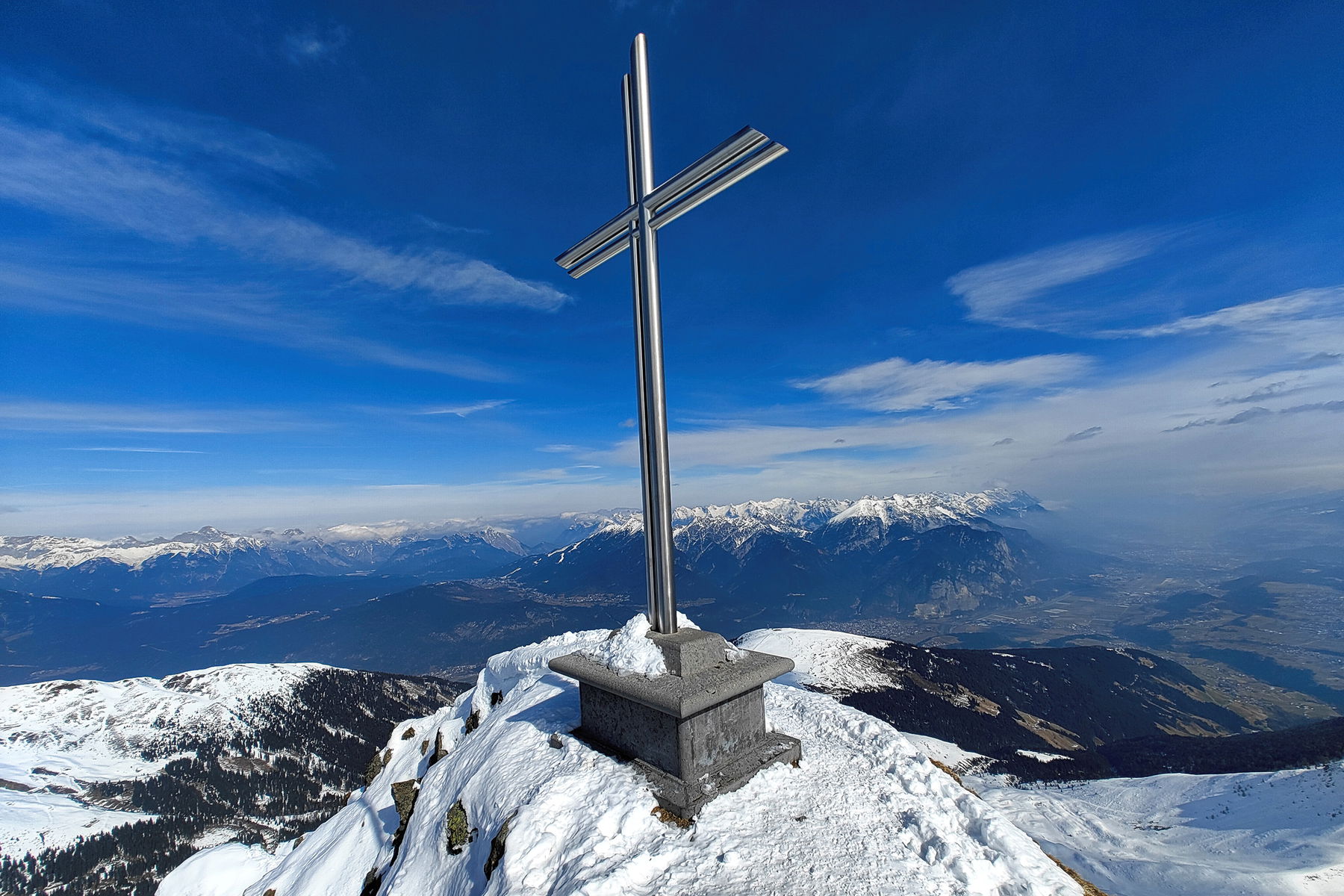 Am Gipfel angekommen genießt man bei entsprechenden Verhältnissen einen Rundumblick übers Inntal, Sellrain und diverse hohe Gipfel in der Ferne.