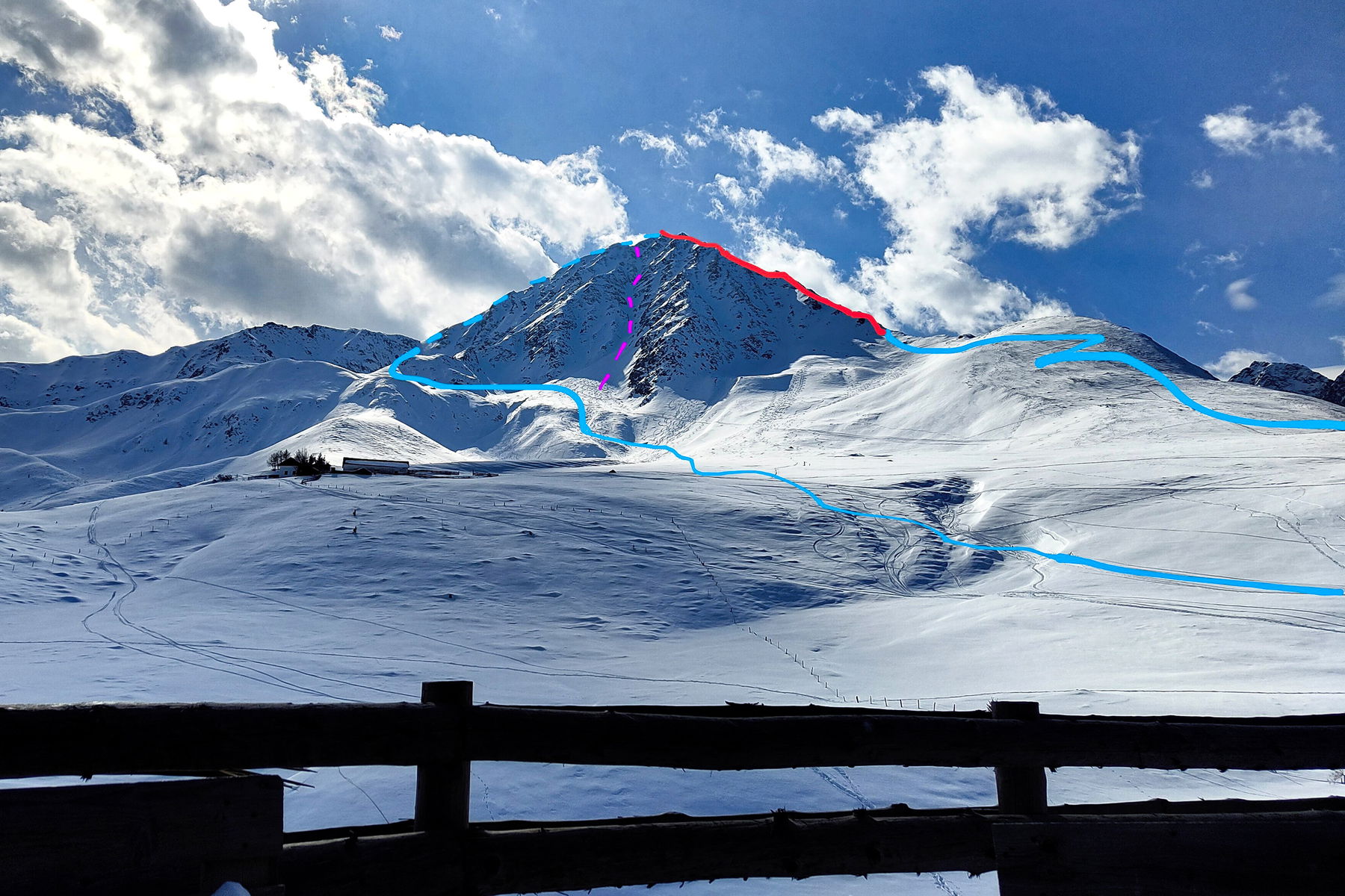 Der gesamte Routenverlauf, Rot der Nordgrat und Violett die Rosskogelrinne. Foto: Simon Widy