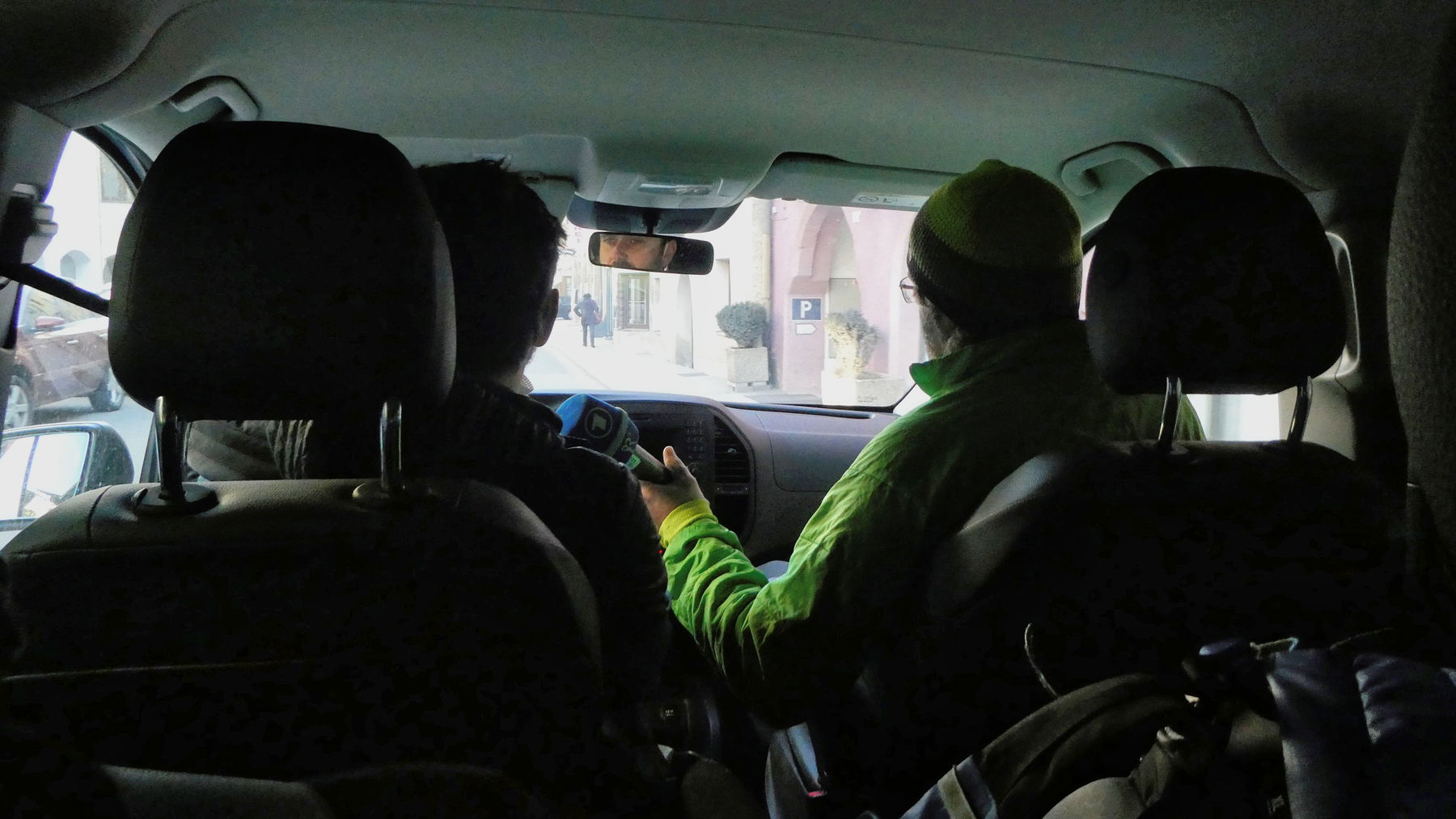 Um Neun Uhr sind wir pünktlich, Felle an den Skiern, vor dem Hotel. Flo (Florian, der Hotelier) lässt uns in den Kleinbus einsteigen. Georg nimmt mit seinem Mikrofon am Beifahrersitz Platz und macht das erste Interview für den Bayerischen Rundfunk. Flo kennt die Strecke, beruhige ich mich. Wenn ich Fragen hören und beantworten sollte, ich könnte nicht auch noch lenken.