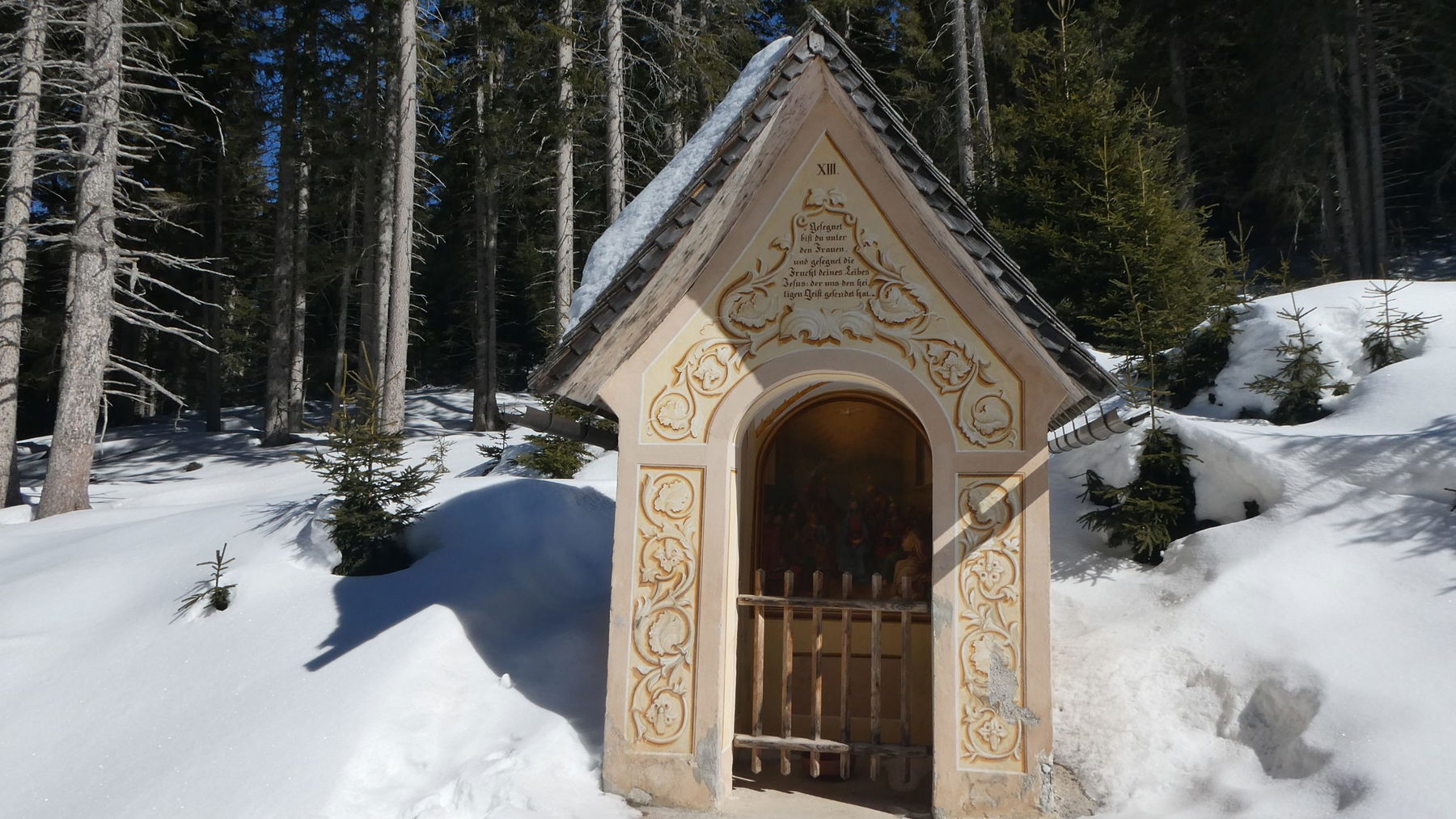 Nach ausgiebiger Pause geht es nun auf einer Forststraße/Langlaufloipe/Winterwanderroute Richtung Maria Waldrast. Die Kapellen am Wegesrand erzählen in Wort und Bild von den Geheimnissen des Rosenkranzes (fälschlich oft als Kreuzwegstationen bezeichnet).