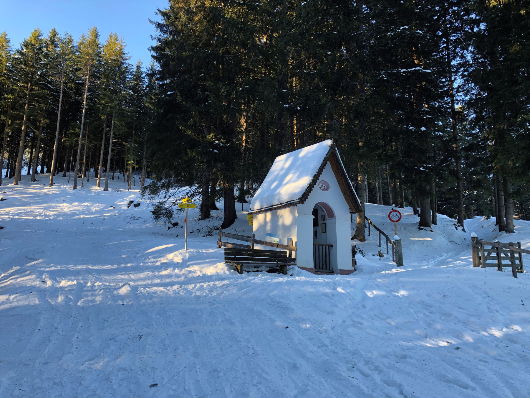 Dem Weg folgen wir bis zum Bauernhof. Hier geht man in Richtung der Heuhütten, oder gleich rechts am Hof vorbei, um über den Sommerweg links vom Bach zu einem Hohlweg zu kommen, der zur Antoniuskapelle weiterführt. An dieser Stelle kommt auch ein Sommerweg von der nördlichen Seite Richtung des Klosters “Maria Waldrast” heraus.