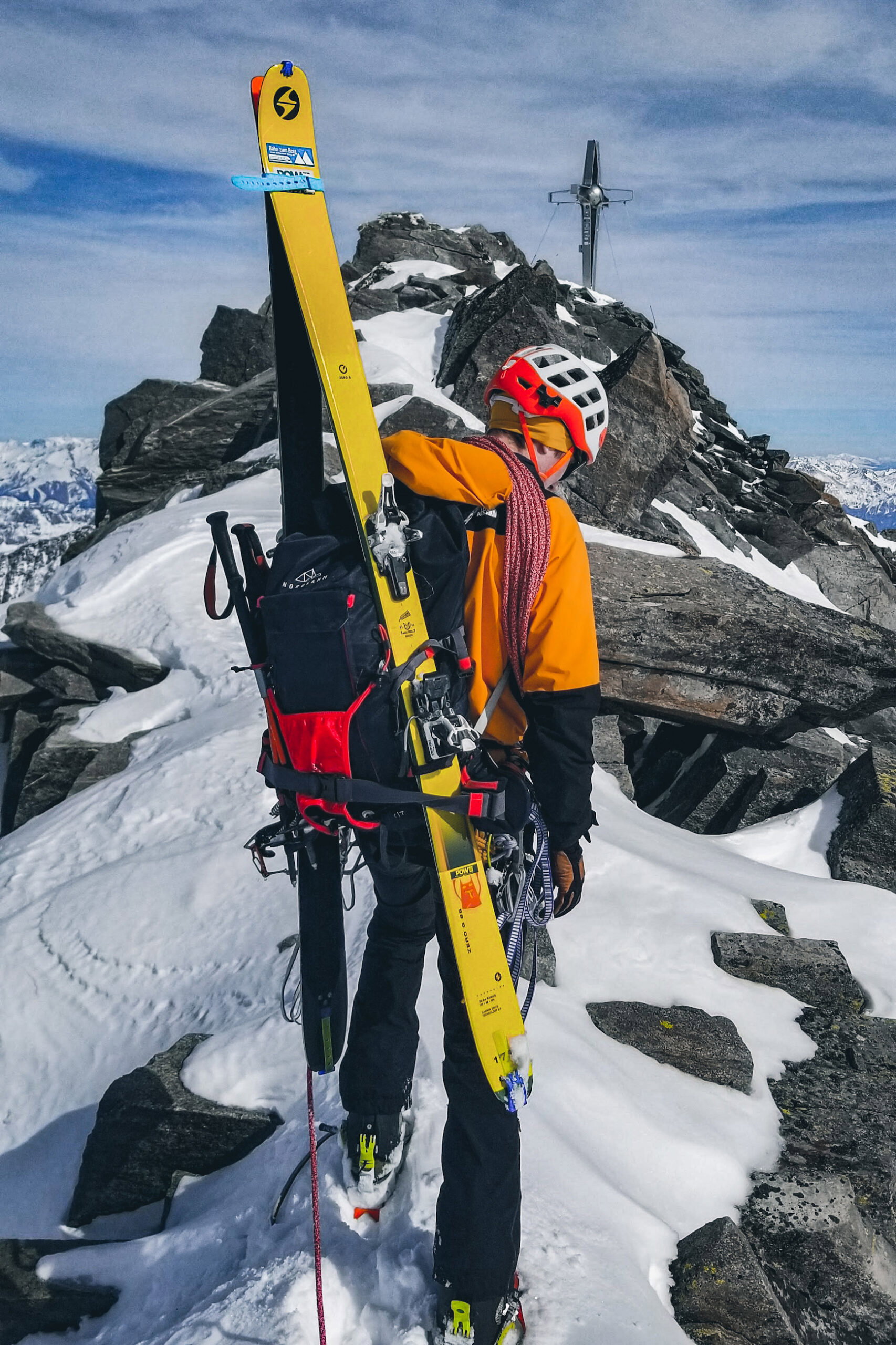 Ausrüstungstechnisch haben wir neben dem Standard-Skitourenequipment ein 60-Meter-Einfachseil, 8 Eisschrauben und Exen, einige Schlingen und Schnüre, 2 Rücklaufsperren und jeweils 2 Eisgeräte und Steigeisen mitgehabt.