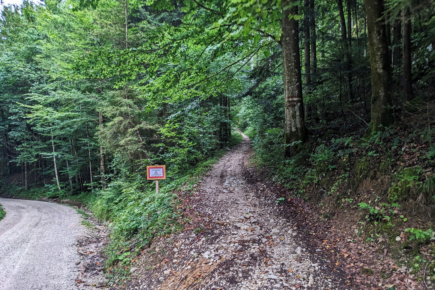 Zuerst wandern wir in weiten Serpentinen auf einem meist breiten Weg bergauf. Bei einem Steinbruch wechseln wir vom Wanderweg auf eine Forststraße, in ihrer ersten Kehre zweigen wir rechts ab. Hier befindet sich der Einstieg zur Querung der “Ewigen Wand” und genauso der steilere Aufstieg über schmälere und wurzeligere Wanderwege zum “Predigstuhl”.