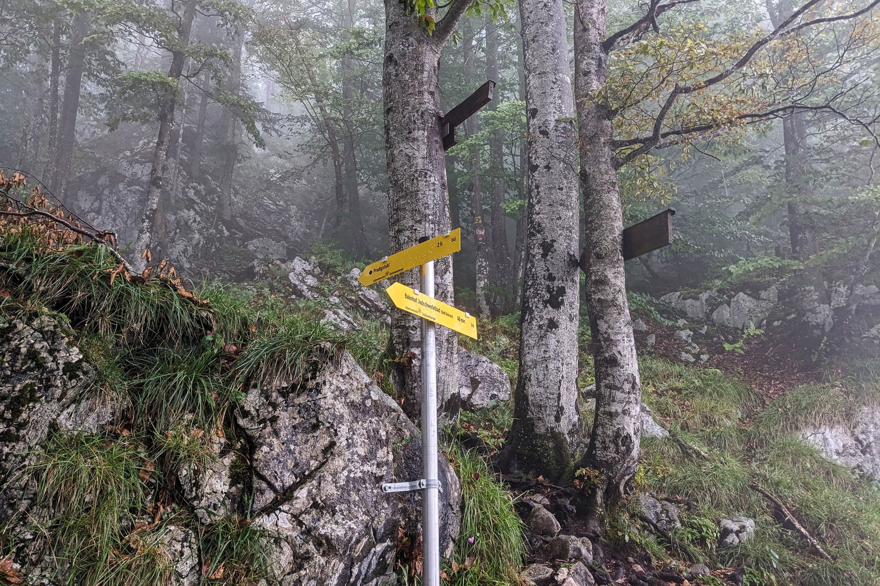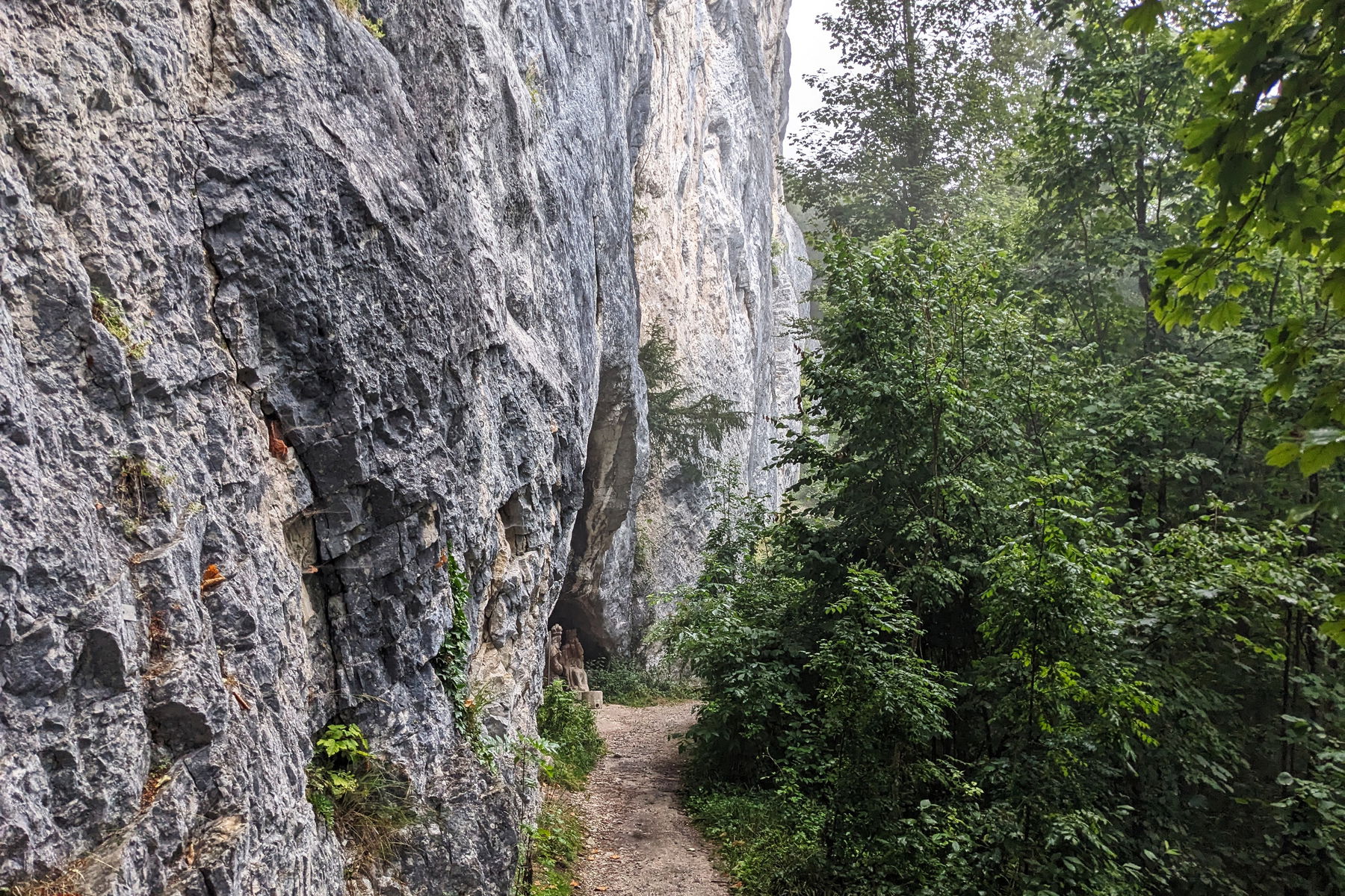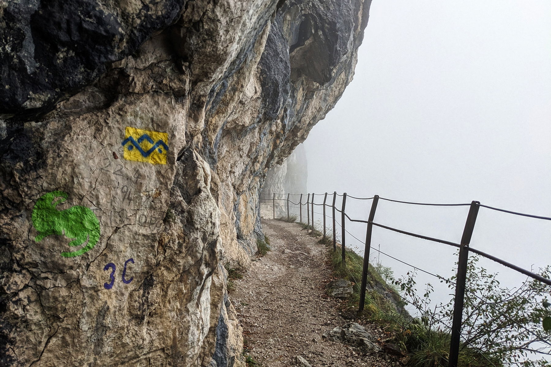Auch bei wolkenfreiem Himmel muss der Ausblick grandios sein! Und die Tunnelpassagen entlang der Wand würden dann sogar Schutz vor der Hitze und UV-Strahlung bieten. Heute ist es darin zwar etwas frisch, ein Erlebnis ist es dennoch, durch die schmalen Gänge zu spazieren. Zwischen den Tunneln führt auch ein kurzer Klettersteig über den Abgrund hinaus. Als wir kurze Zeit später wieder in den Wald gelangen, entdecken wir in der uns immer noch begleitenden Felswand Kletterrouten! Die Ewige Wand macht den Eindruck eines alpinen Spielplatzes.