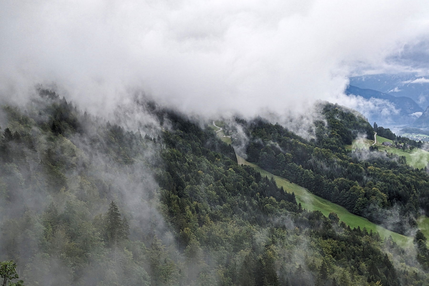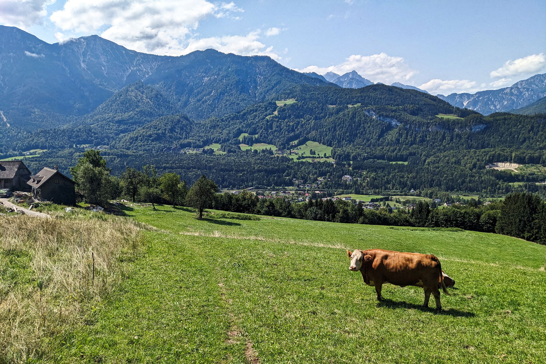 Bei dem Hof führt der Abstieg rechts zwischen den Gebäuden hindurch. Über den Rücken der unterhalb liegenden, weiten Wiese steigen wir weiter ab. Dabei speichern wir ein letztes Mal den schönen Ausblick gedanklich ab! Bald tauchen wir in den Wald ein und kommen dann schon im Siedlungsgebiet von Bad Goisern heraus.