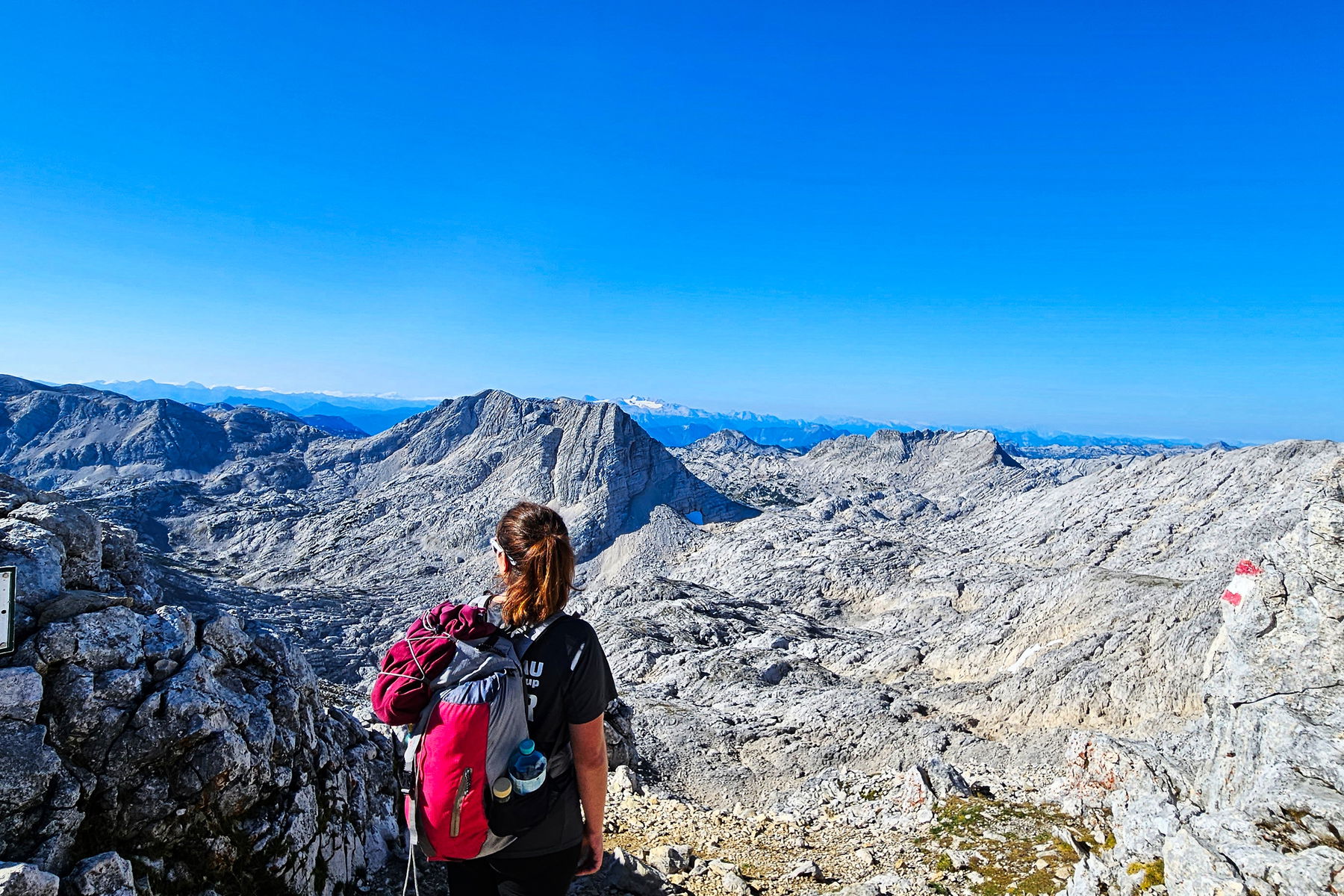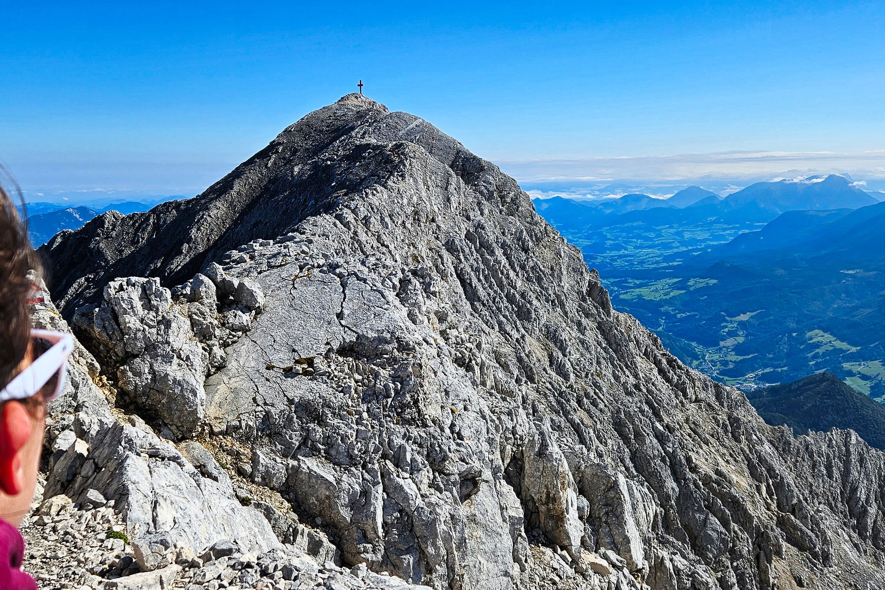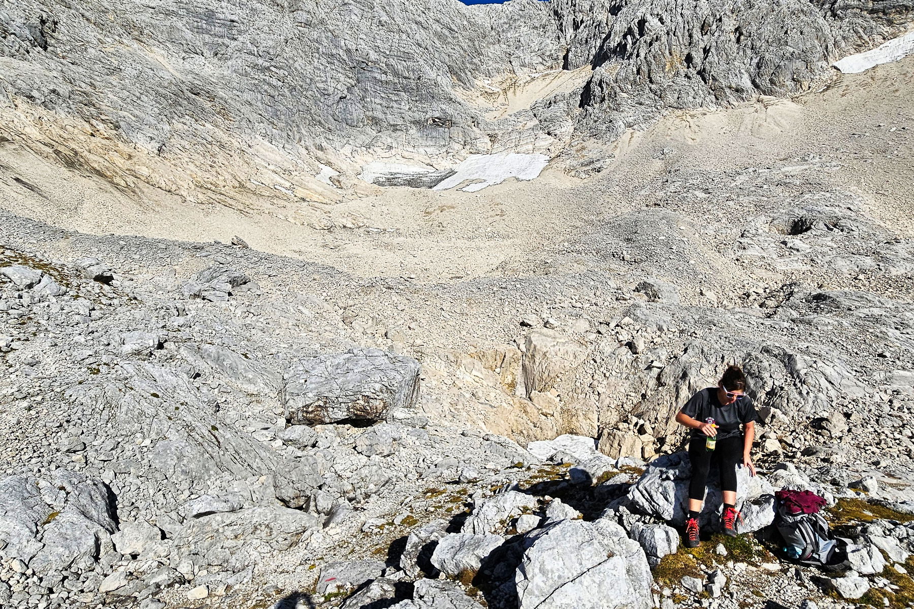 Nach einer kurzen Stärkung geht es weiter über Schotterwege und steile Kletterpassagen (Trittsicherheit und Schwindelfreiheit absolut notwendig) zur Brotfallscharte auf 2.340 Metern – ab hier erstreckt sich ein traumhafter Blick aufs tote Gebirge bis zum Dachstein.