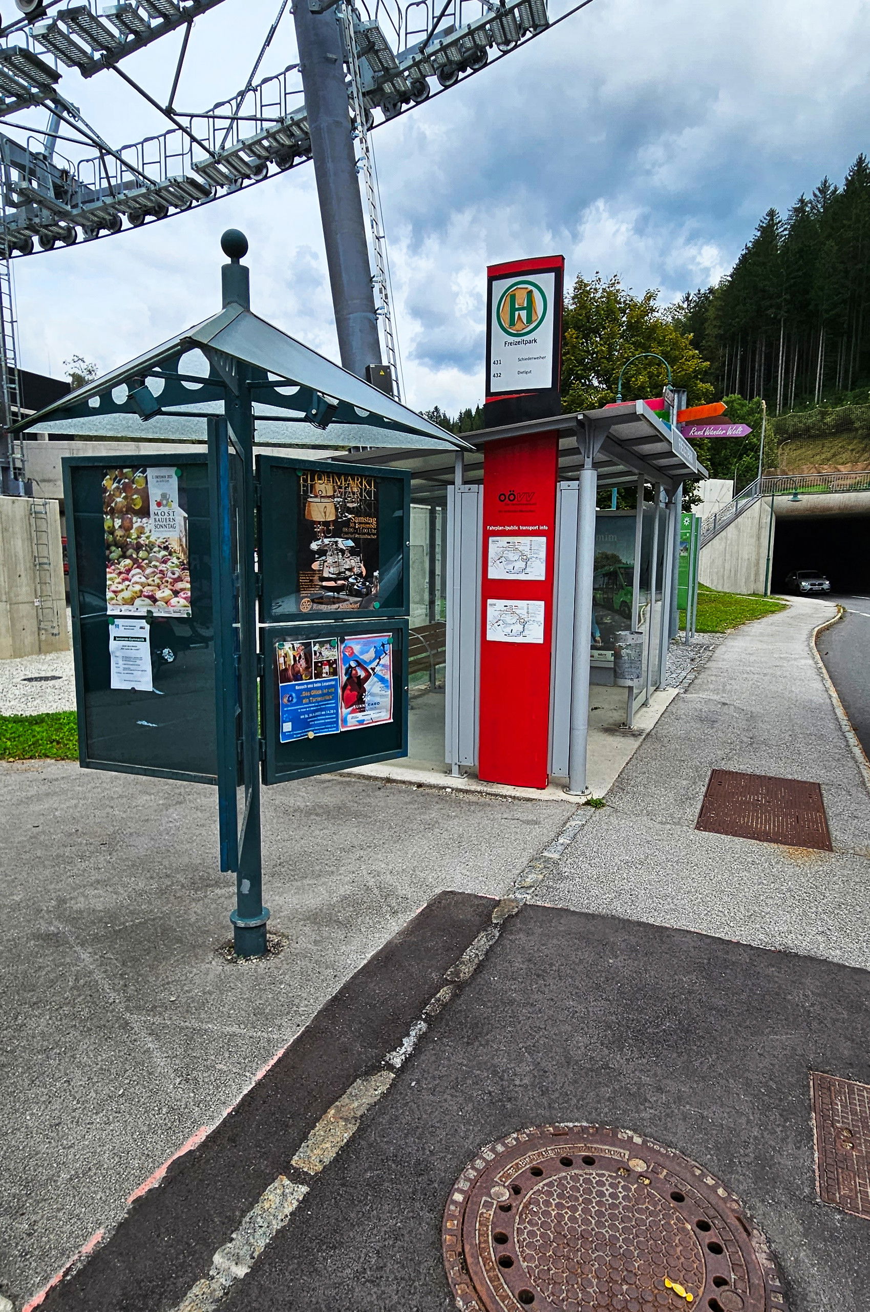 Links: Haltestelle Hinterstoder. Foto: Mario Viehböck. Rechts: Restauriertes Gipfelkreuz. Foto: Pia Gerhofer