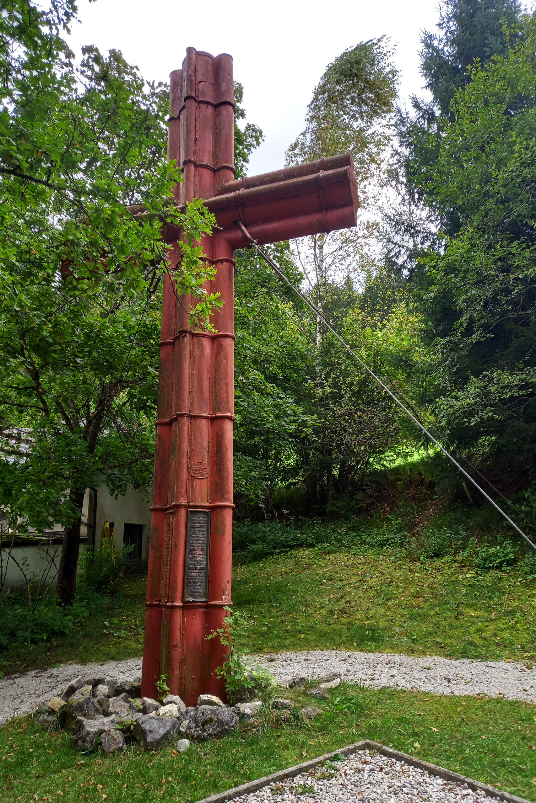 Am frühen Nachmittag starten wir unsere Zwei-Tagestour am Linzer Bahnhof, nach einer kurzen Zugfahrt inklusive Mittagessen steigen wir heute in Hinterstoder am Bahnhof aus, und in den bereits wartenden Bus ein. Mit dem geht es bis zur Haltestelle Hinterstoder Gemeindehaus, neben der auch die Kirche liegt. Neben der Kirche steht das bekannte wunderschöne rote Gipfelkreuz, dessen Duplikat auch auf unserem Zielgipfel, dem großen Priel, steht. 2008 wurde das Gipfelkreuz, das zuvor 138 Jahre am Gipfel stand, von einem Sturm umgeworfen – dieses Kreuz wurde dann restauriert und steht nun neben der Kirche.