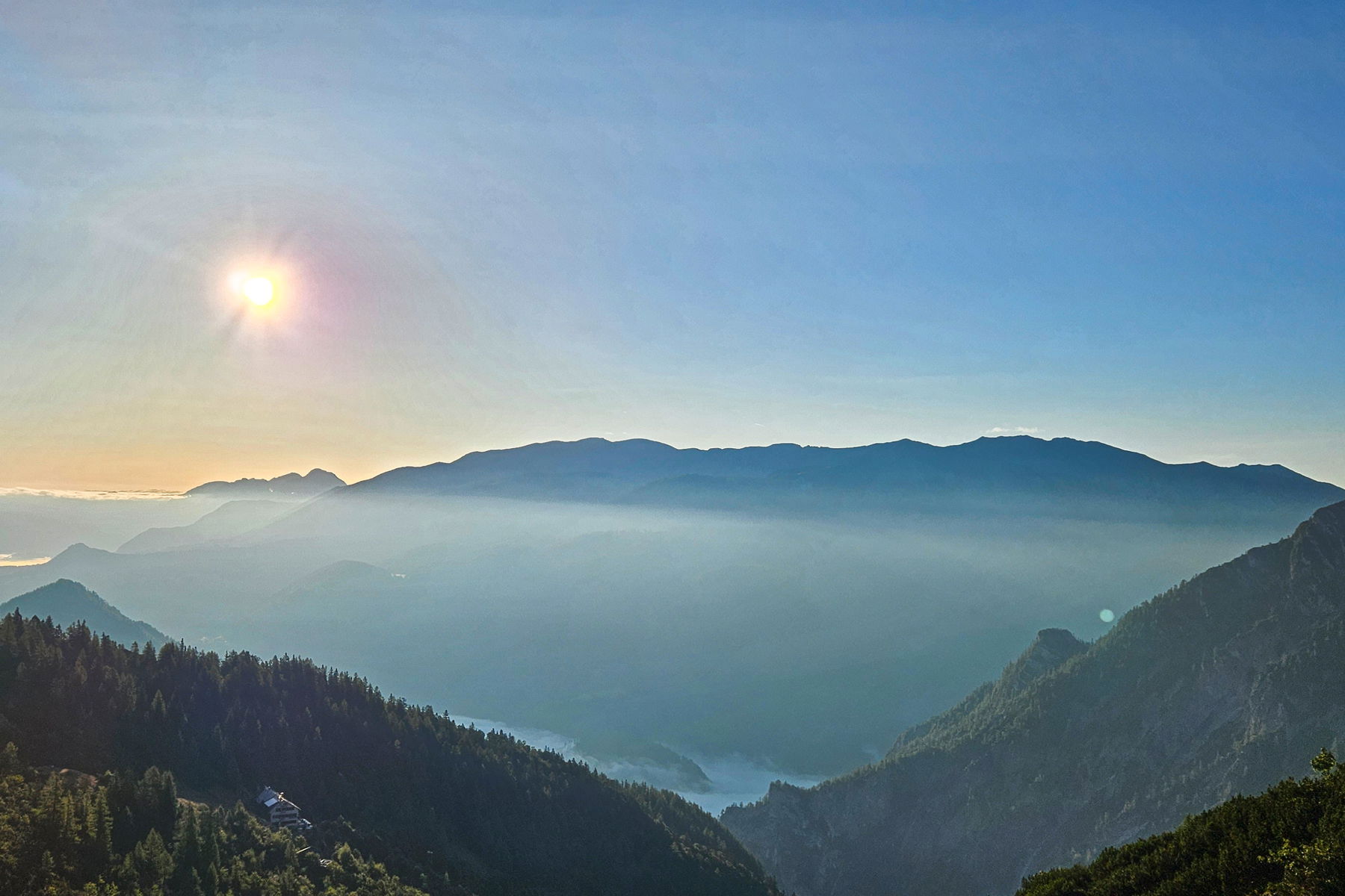 Nach einer sehr erholsamen Nacht, starten wir um 6:30 Uhr früh mit unserem Frühstück auf der Hütte. Den Sonnenaufgang können wir von der Terasse des Schutzhauses aus wunderbar beobachten, im Tal sind noch einige Nebelfelder doch wir sehen die umliegenden Berggipfel schon hervorblitzen.