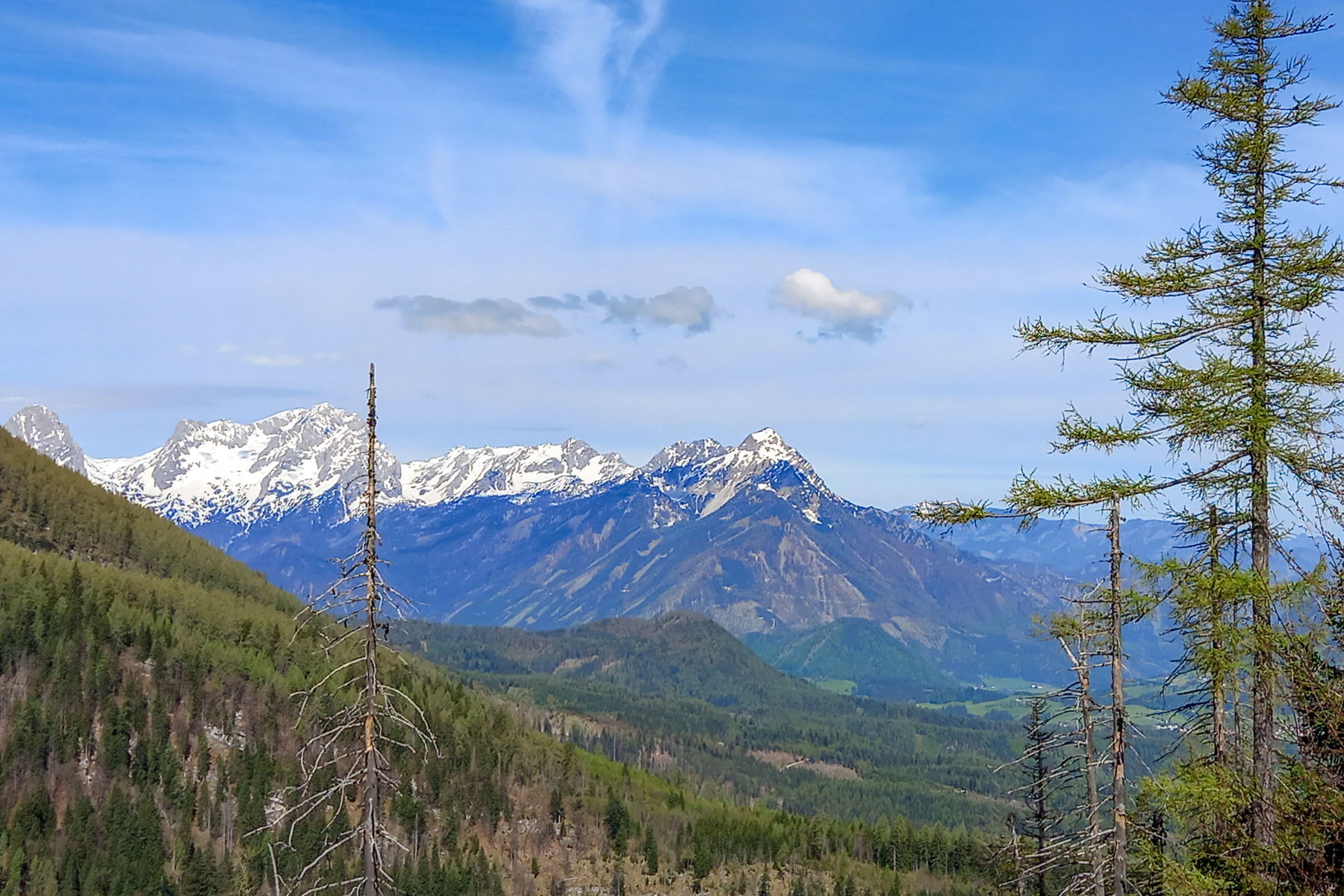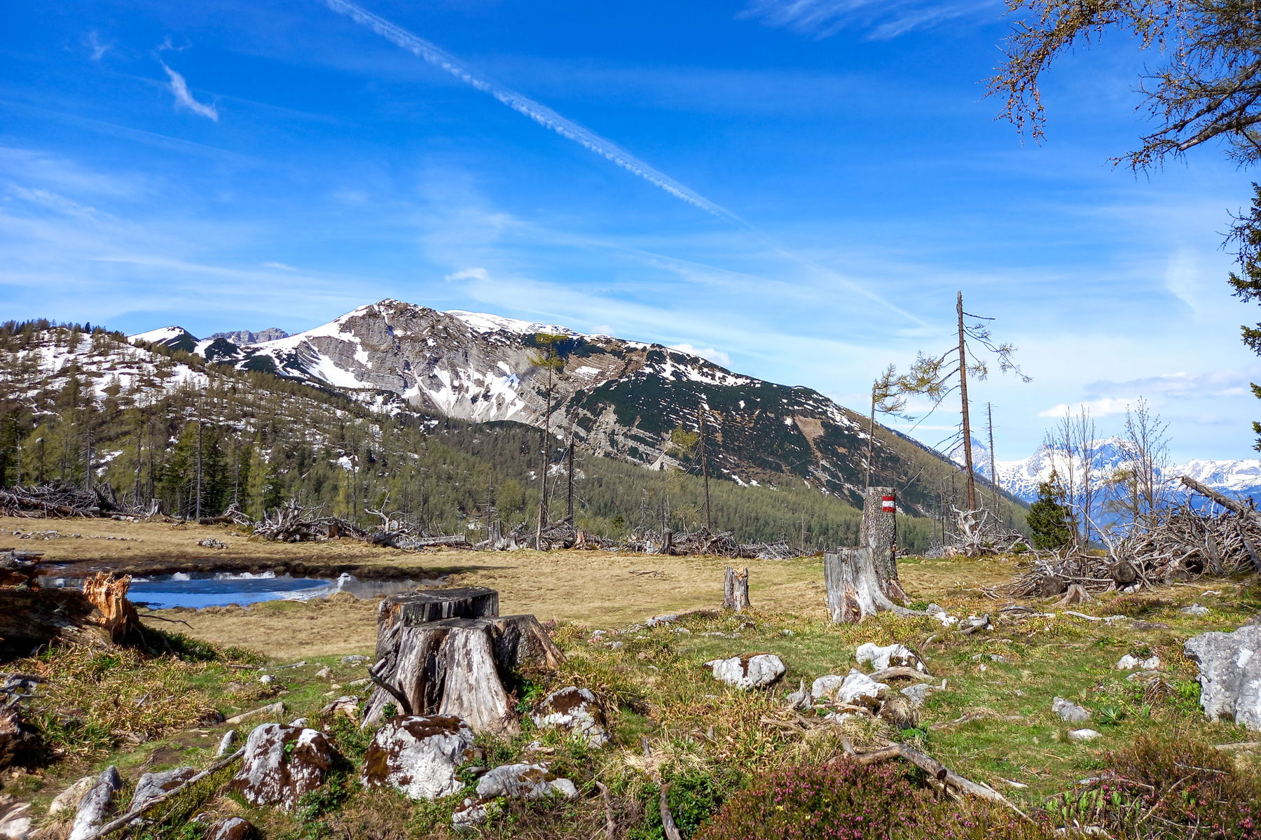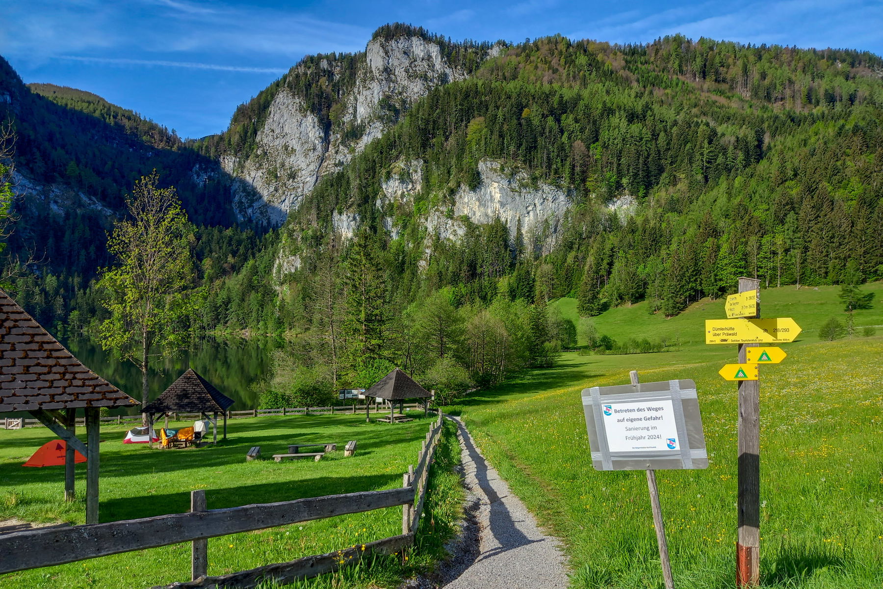 Auf einer Seehöhe von circa 1.100 Meter biege ich nach links ab und folge nun dem Weg 292 weiter steil bergauf, ständig begleitet vom Donnergrollen der Lawinen, die von der gegenüberliegenden Warscheneckgruppe abgehen.