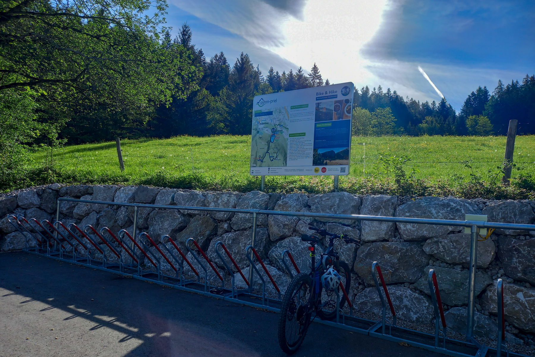 Beim Gleinkersee angekommen, kann das Rad direkt an der so genannten Wechselstation abgestellt werden. Hier tausche ich die Pedale gegen meine Wanderstöcke und es geht zu Fuß weiter. Gegenüber der Wechselstation beginnt dann auch schon der markierte Wanderweg.