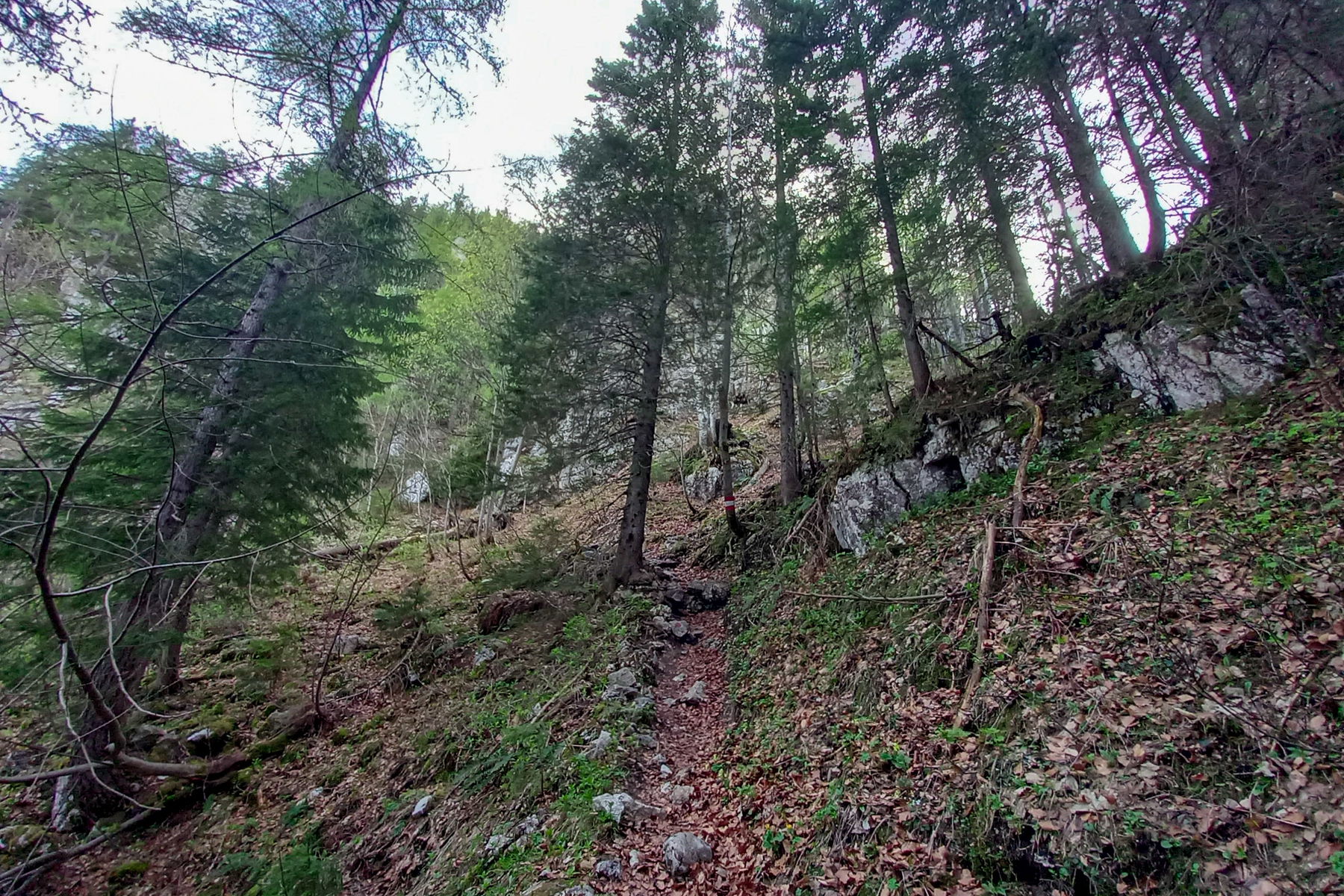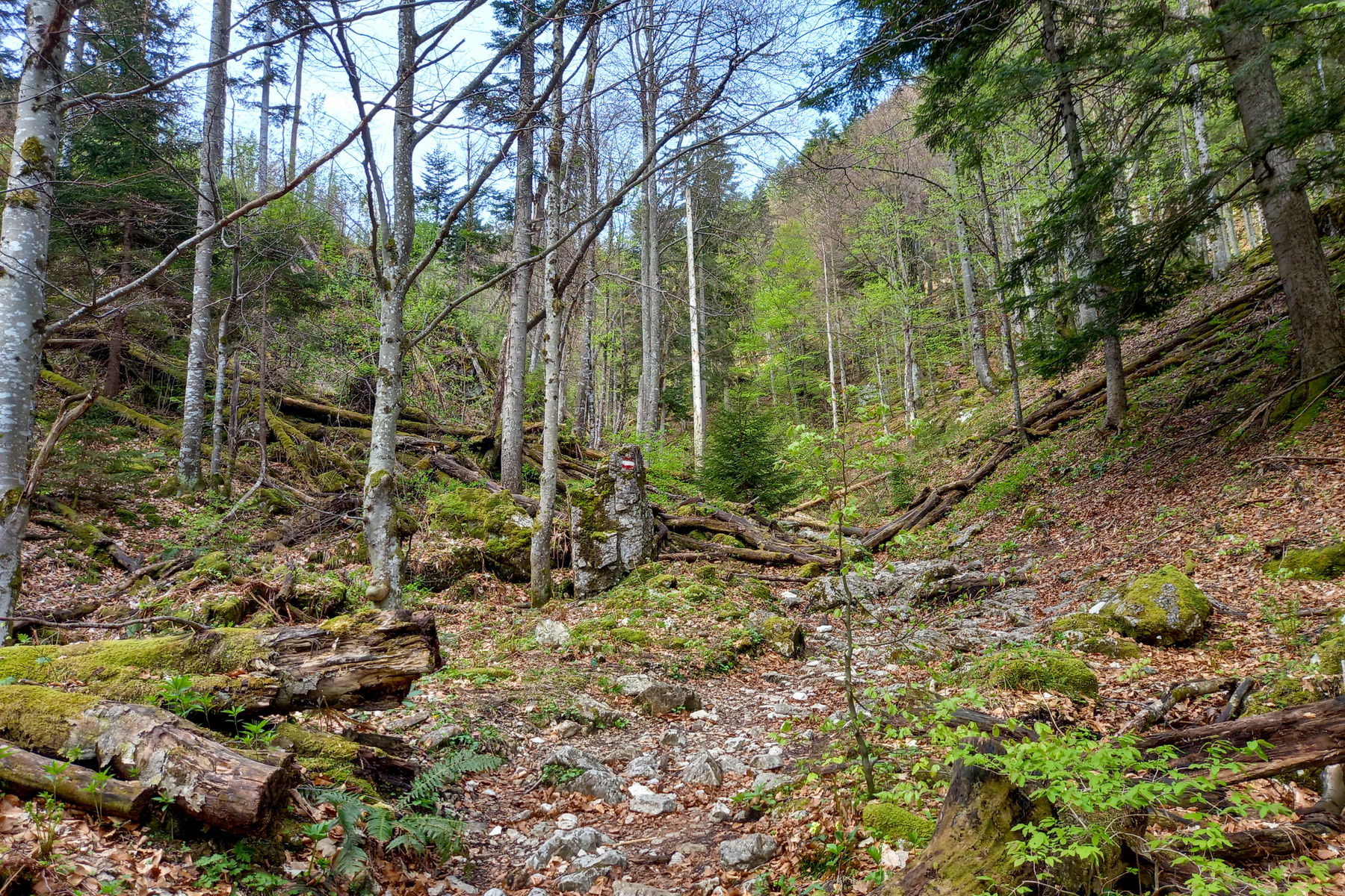 Kurz nachdem ich den See hinter mir gelassen habe und der Weg in den Wald abzweigt, geht es richtig los. Der Weg geht in einen steilen, verblockten Pfad über. Schon im unteren Teil des Steiges fällt mir das viele Totholz im Wald auf. Und je höher ich komme, desto mehr sehe ich davon.
