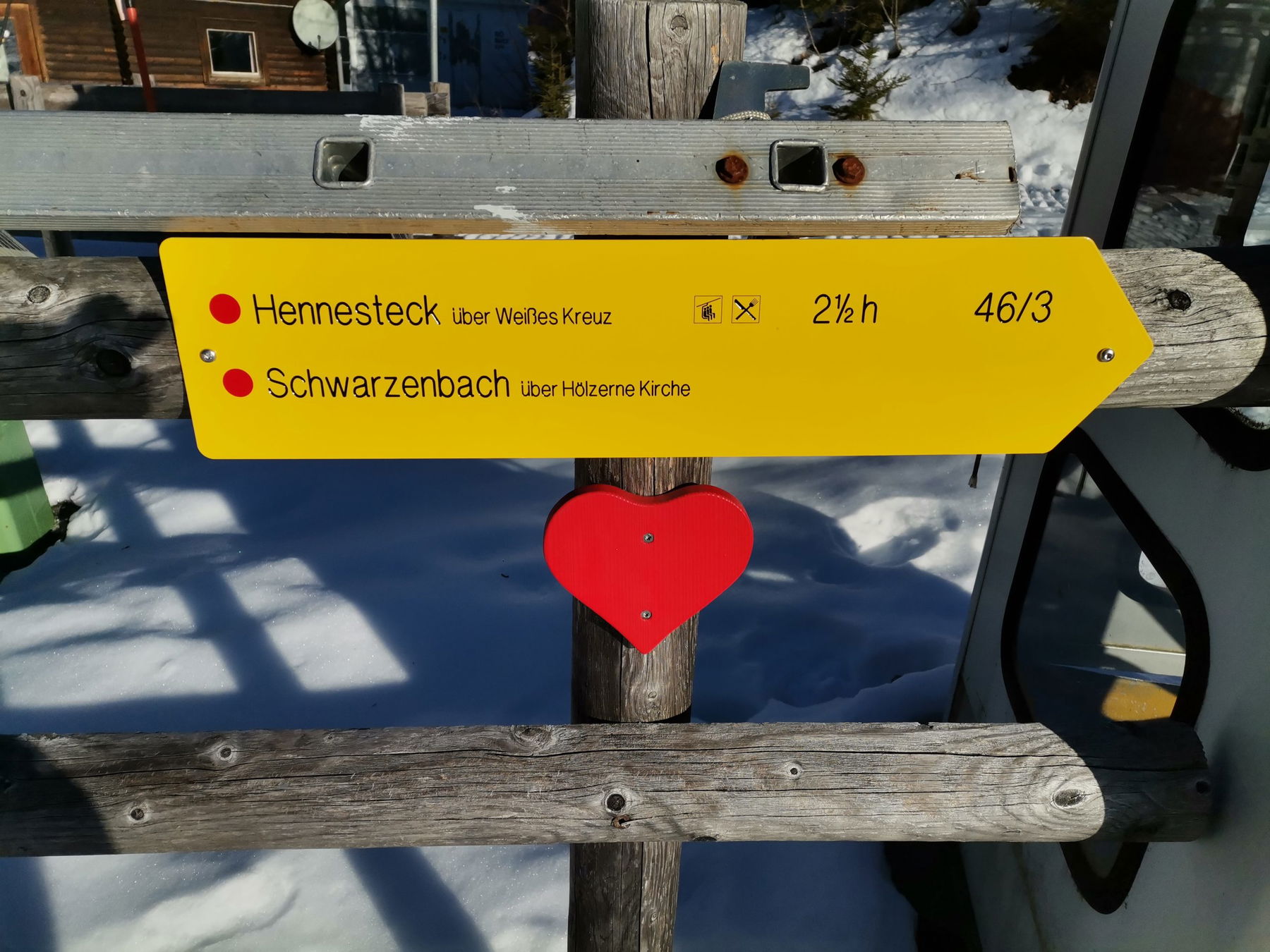 Von der Bus Haltestelle könnte man gleich den Wanderweg Richtung Annaberg Zentrum nehmen und dann links Richtung Weißes Kreuz auf den Pielachtaler Pilgerweg abbiegen. Wir wandern aber unterhalb des Teichstüberls vorbei zur Talstation des Babylifts, weil dort der Herzerlweg beginnt – netterweise (fast)durchgehend herzig markiert. Noch ohne geeignete Aufstiegshilfen unter unseren Füßen. Bald aber merken wir, dass der Schnee heute beinhart gefroren ist. Deshalb bleiben die Schneeschuhe am Rucksack. Grödel sind hier dienlicher.