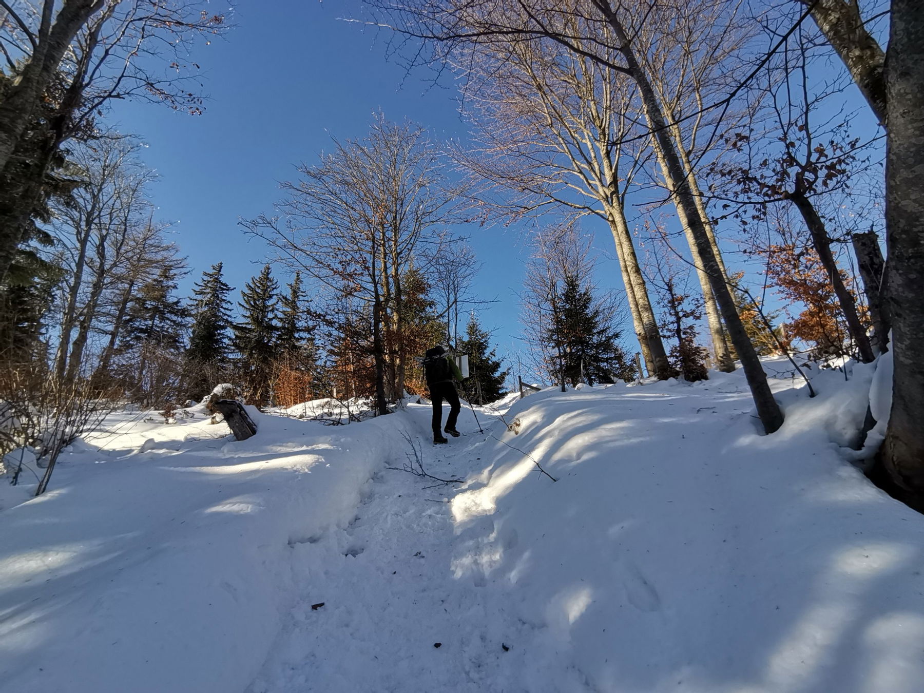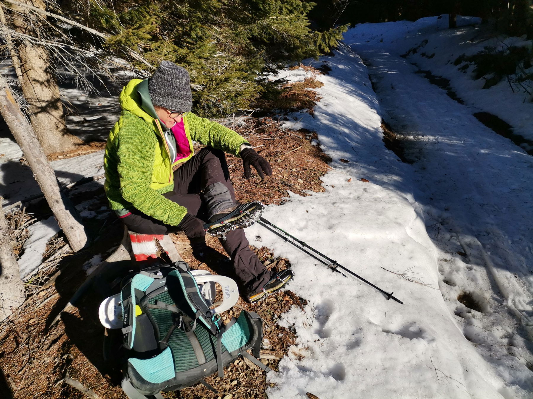 Später im Wald steilt der Pfad kurz aber ordentlich auf. Wir sind froh, Grödel angelegt zu haben – ohne die kein weiterkommen, denn der Schnee ist mit einer blanken Eisschicht überzogen.