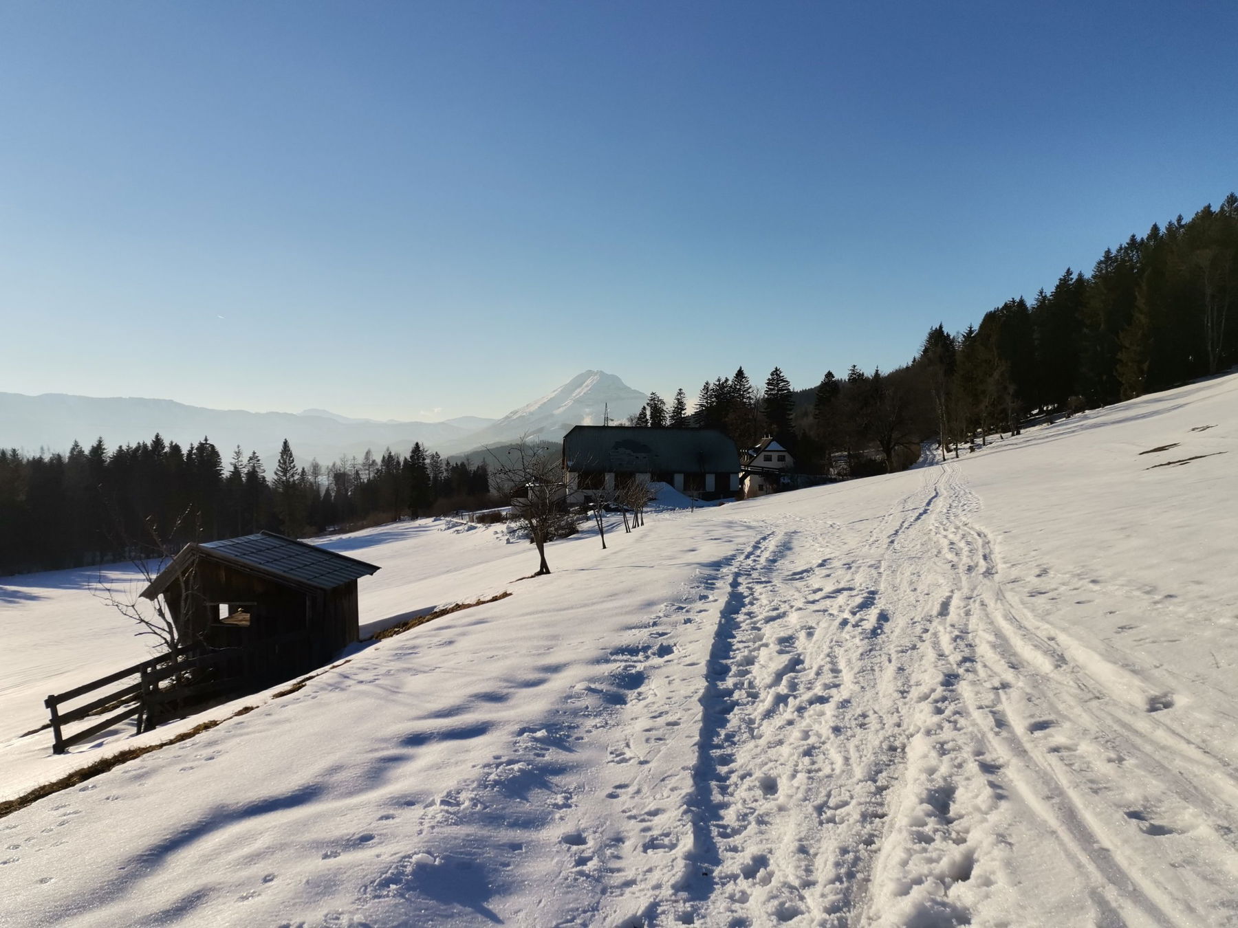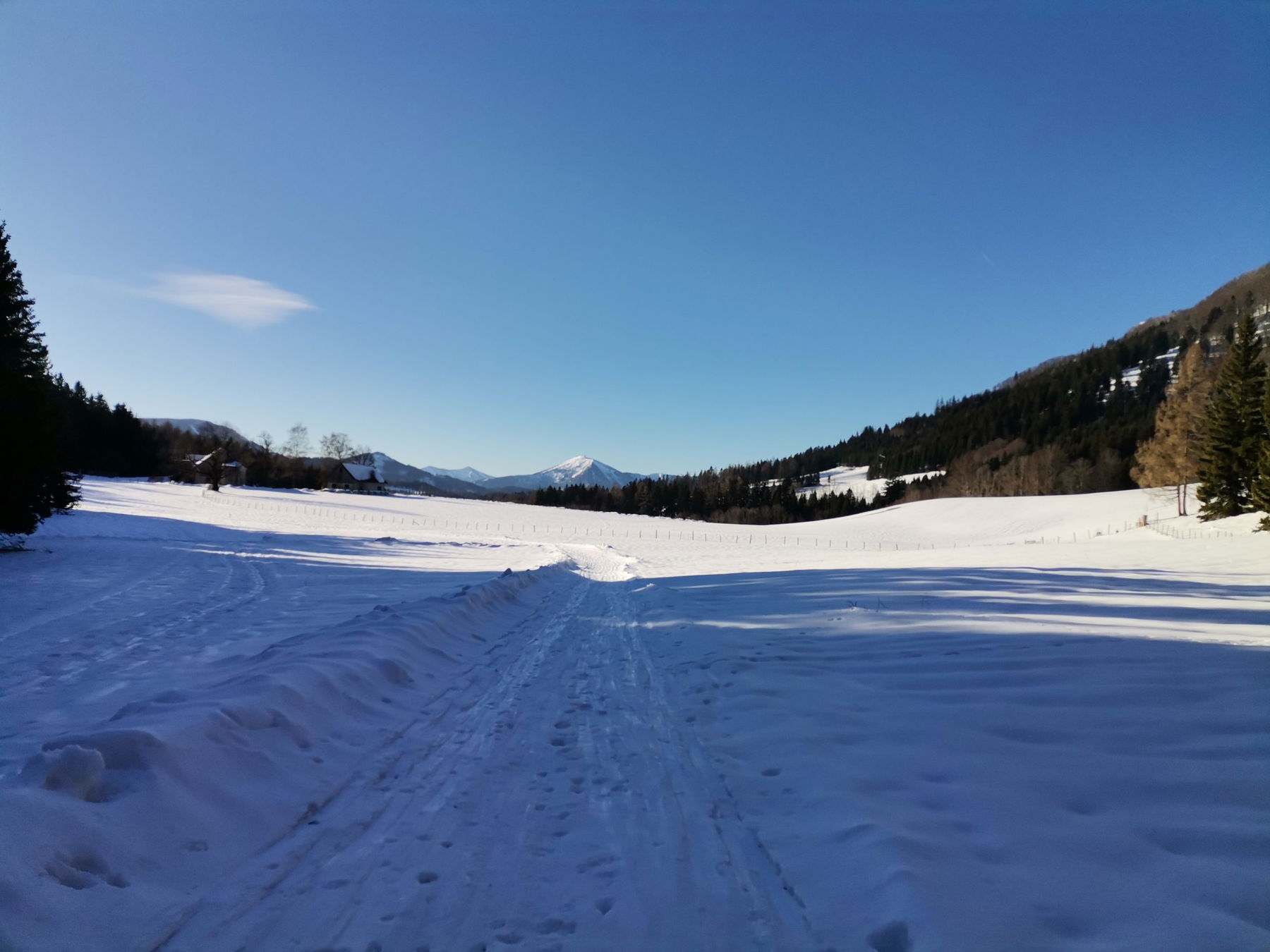 Zwischen die schönen Wald- und Wiesenquerungen schwindelt sich ein leider geräumtes Stück Forststraße. Eisig ist es trotzdem, deshalb bleiben die Grödel drauf.