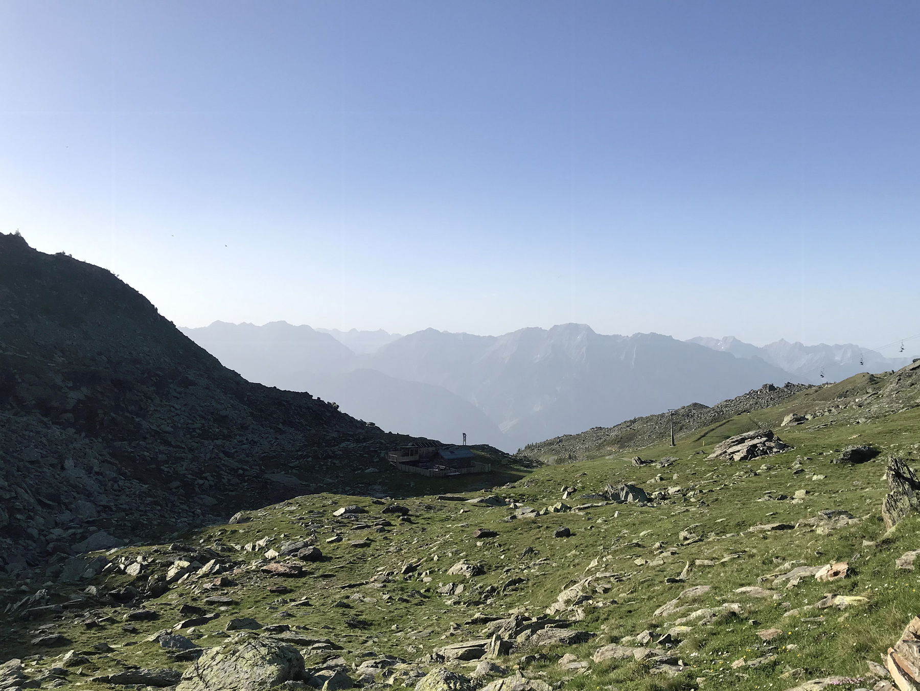 Bei der Besteigung des Gipfel lassen wir erstmal die Hütte rechts liegen und genießen den Ausblick, der sich nun auch Richtung Süden eröffnet. Vom Gipfel steigt man ein paar Höhenmeter zur Glungezer Hütte hinunter ab. Hier habe ich den Fehler gemacht mit vollem Karacho hinter der Hütte vorbeizulaufen. Das mag der Hüttenhund gar nicht. In gemäßigten Tempo dann wieder kurz bergan auf die Sonnenspitze die sich direkt hinter der Hütte erhebt.