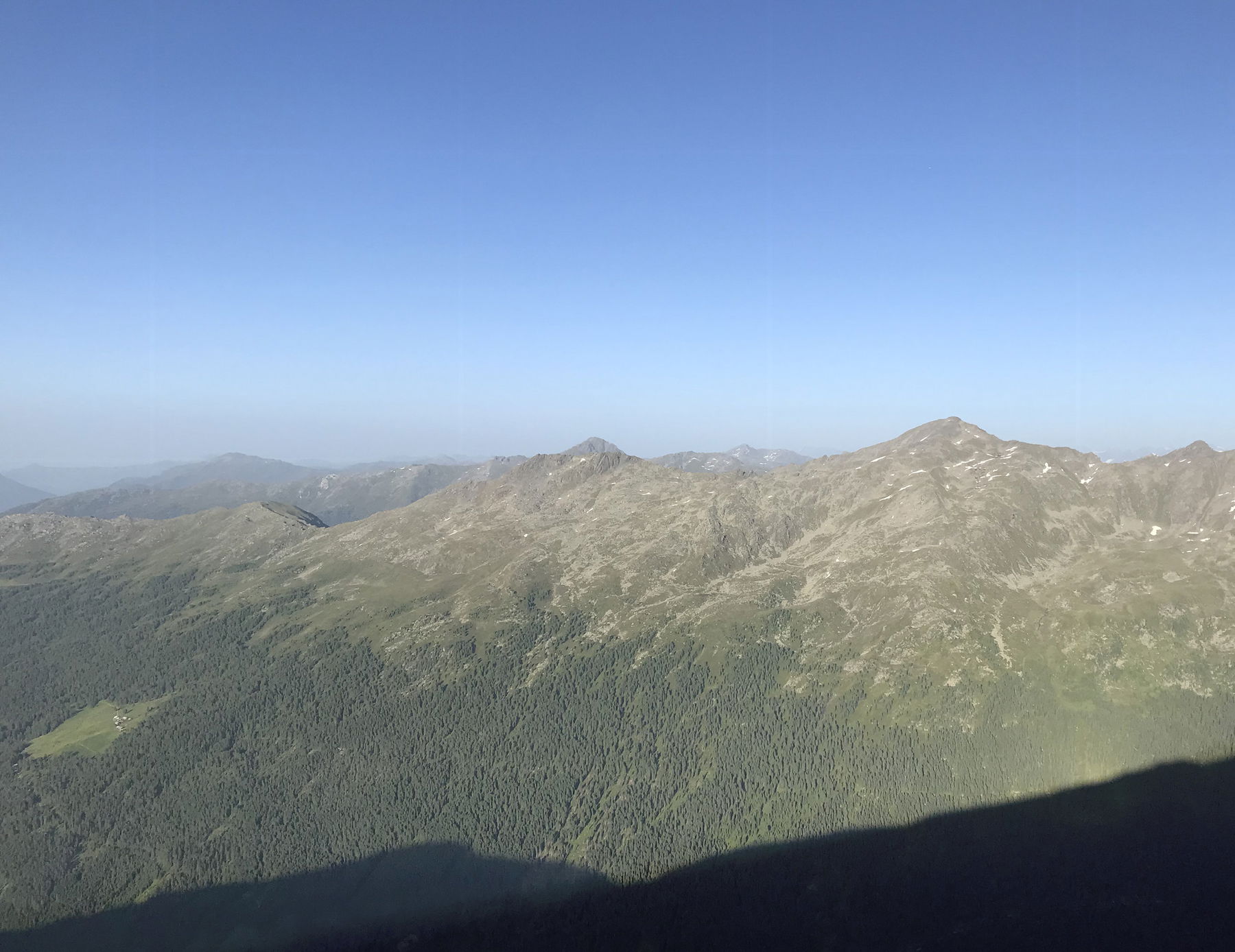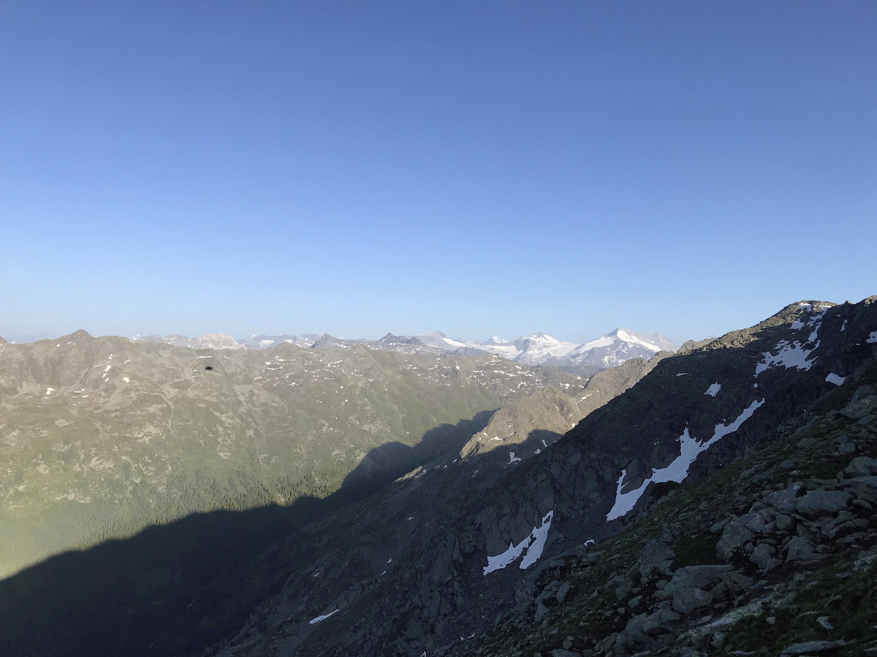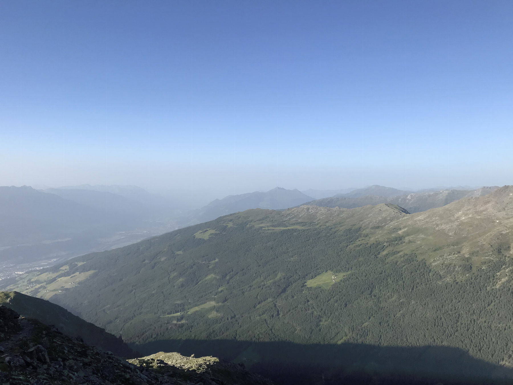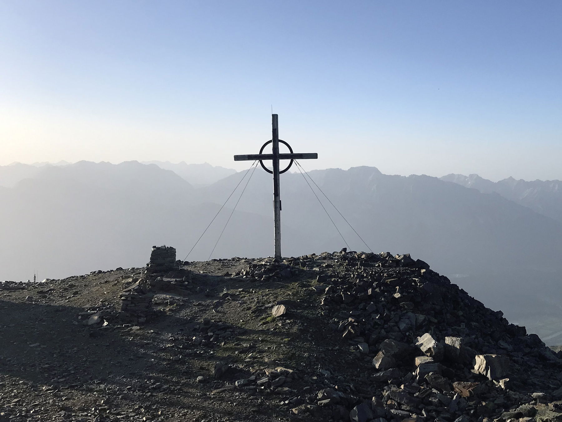 Zuerst kommen ein paar größere Felsbuckel die bezwungen werden wollen. Gegen Ende wird es etwas steiler und in Serpentinen geht es über leicht schottriges, meist aber über erdigen Almboden hinauf zum Gipfelkreuz des Glungezers (2677 m ü.d.A) . Der Schweiß rinnt aber dennoch schaffe ich es die Linse der Handykamera halbwegs trocken zu bekommen und kann den tollen Ausblick ablichten.