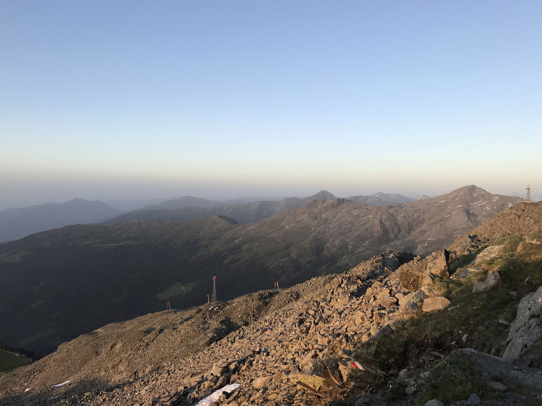 Nach dem Sonnenuntergang geht es runter wieder hinter der Glungezer Hütte vorbei. Weiter entlang des Gipfelhanges Richtung Osten auf den Panoramasteig, also den Aufstiegsweg zusteuernd. Weil es dunkel war war es orientierungstechnischen Gründen ratsam denselben Weg wie beim Aufstieg zu nehmen. Alternativ kann man auch über einen leichten seilversicherten Klettersteig absteigen und gelangt so zum Zirbensee hinunter.