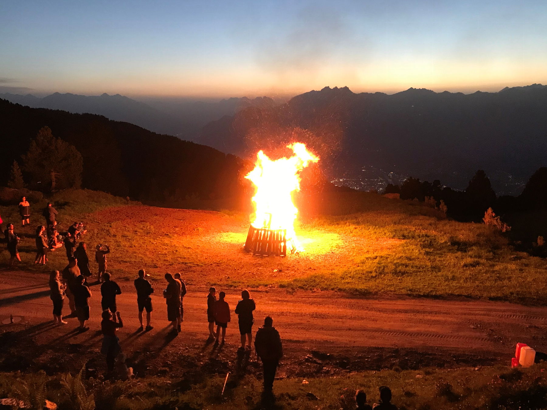 Immer zu Sonnwend wird dann ein Stück hinter der Tulfeiner Alm, Richtung Norden, ein großes Feuer entzündet. Nachdem es ein sehr lauer Sommerabend war hab ich mir dann auch dieses Spektakel reingezogen bevor es wieder mit den 2 Sektionen der Glungezerbahnen zurück ins Tal ging.