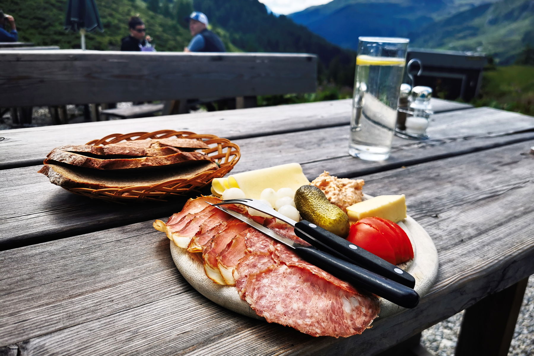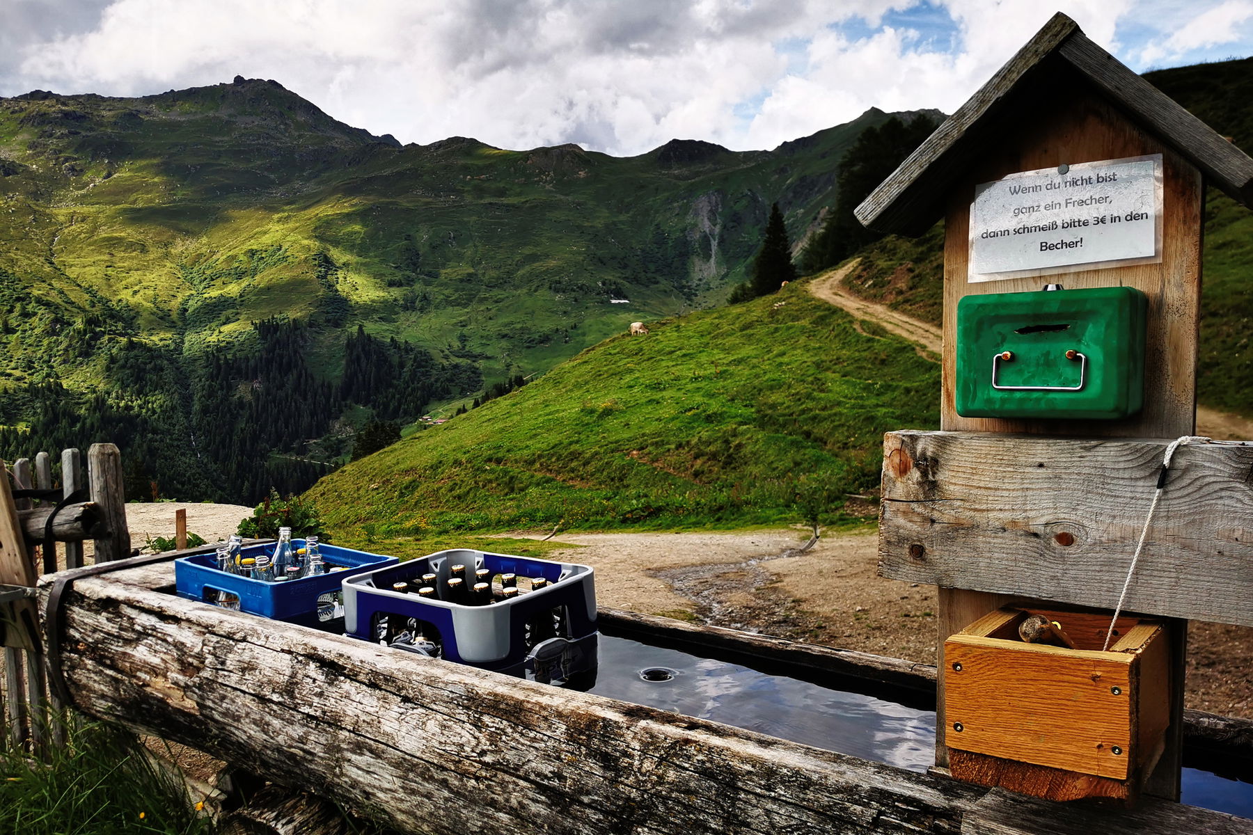 Erika erklärt, dass sie aus der Milch der Kühe Butter schlegelt und Graukäse macht. Diese guten Almprodukte findet man auch auf der kleinen, aber feinen Speisekarte der Alm. Wir entscheiden uns für eine Almjause und verkosten die Produkte sogleich – sehr empfehlenswert! Nach der gemütlichen Rast wandern wir weiter auf und ab über das Almgebiet zur nächsten Alm, der Poltnalm auf 1.880 Meter. Von dort hat man einen atemberaubenden Blick hinaus ins Navistal. Wir entscheiden uns hier für ein schnelles Erfrischungsgetränk vom Brunnen, wo Bier, Radler und Limonaden gekühlt werden. „Wenn du nicht bist ein Frecher, wirf 3 Euro in den Becher“ steht bei der Kassa dabei. Eine gute Idee und sehr einladend, vor allem an heißen Tagen. Weiter geht es über die schön blühenden Almwiesen bis zur nächsten und für uns letzten Alm, der Stöcklalm (Achtung: Von der Poltnalm zur Stöcklalm gibt es nur einen Wandersteig, keinen MTB-Weg!).