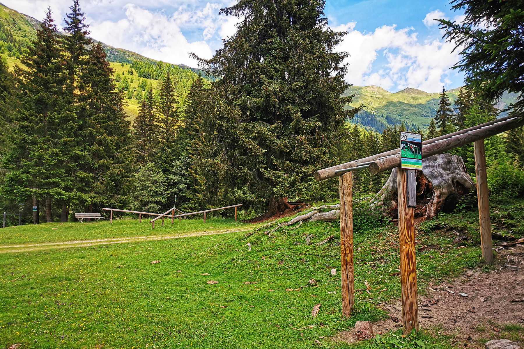 Startpunkt ist die Haltestelle Navis Dorf. Viele Wanderschilder weisen uns direkt ab der Haltestelle den Weg. Vorbei an der Ortsbank folgen wir der Straße. Eine Steinschlagschutzverbauung bietet uns zwischendurch Schatten, bis wir beim „Parkplatz Schranzberg“, wo der Bus bei seiner Rückfahrt vorbeikommt, die Asphaltstraße verlassen. Es geht zuerst ohne große Steigung am Bach entlang über die „Aue“ in Richtung Peeralm. Dabei kommt man bei der „Fitnessmeile“ vorbei. An vielen verschiedenen Stationen kann man sich aufwärmen und Fitnessübungen machen. Danach folgt der Aufstieg über einen Steig zur Peeralm, wo man am Gehege der Almschweine von Peer Karl vorbeikommt. Die Schweine genießen den Auslauf im Freien und fühlen sich augenscheinlich „sauwohl“.