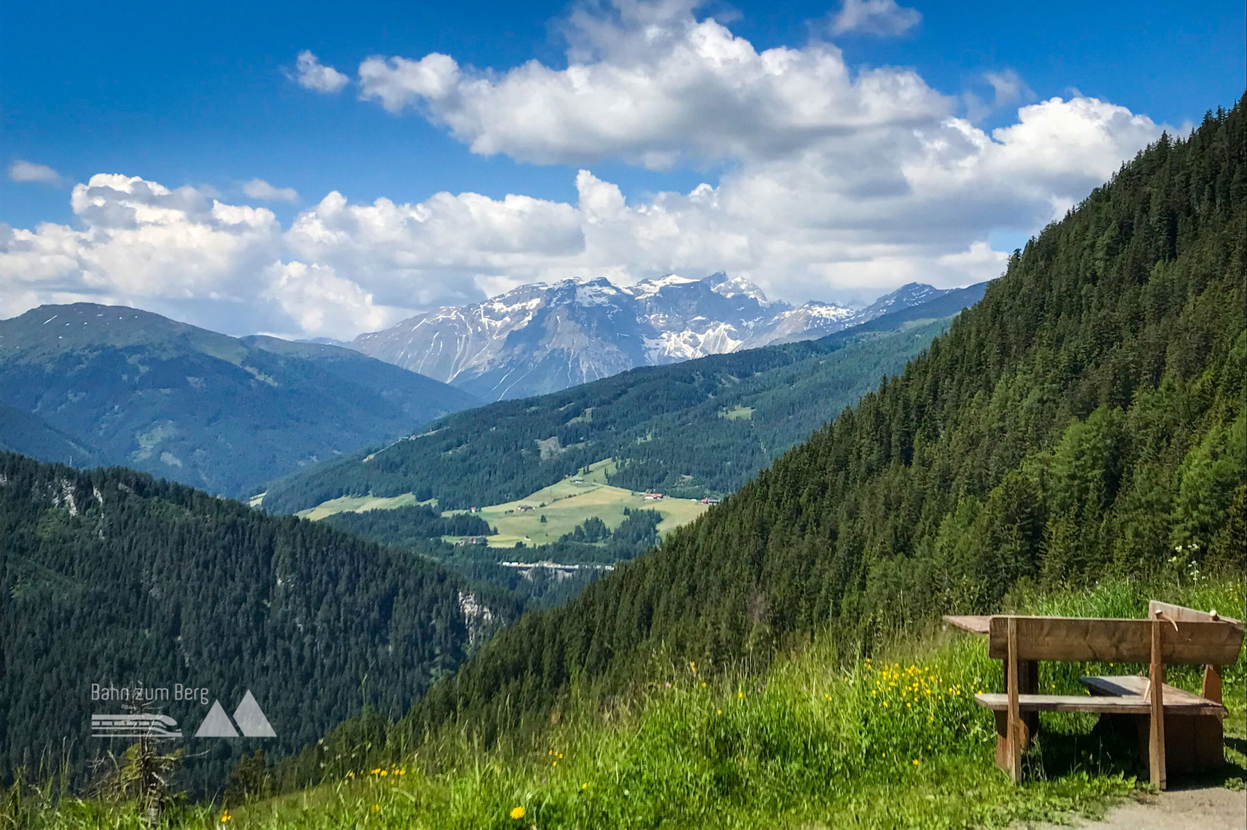 Endlich oben, wartet wieder ein gemütliches Jausenbankerl. Direkt im Südosten ragen die höchsten Berge der Tuxer Alpen in den Himmel. In Richtung Südwesten schaut man auf den Brenner Grenzkamm und die Bergeralm, im Norden die restlichen Tuxer Alpen vor Innsbruck.
