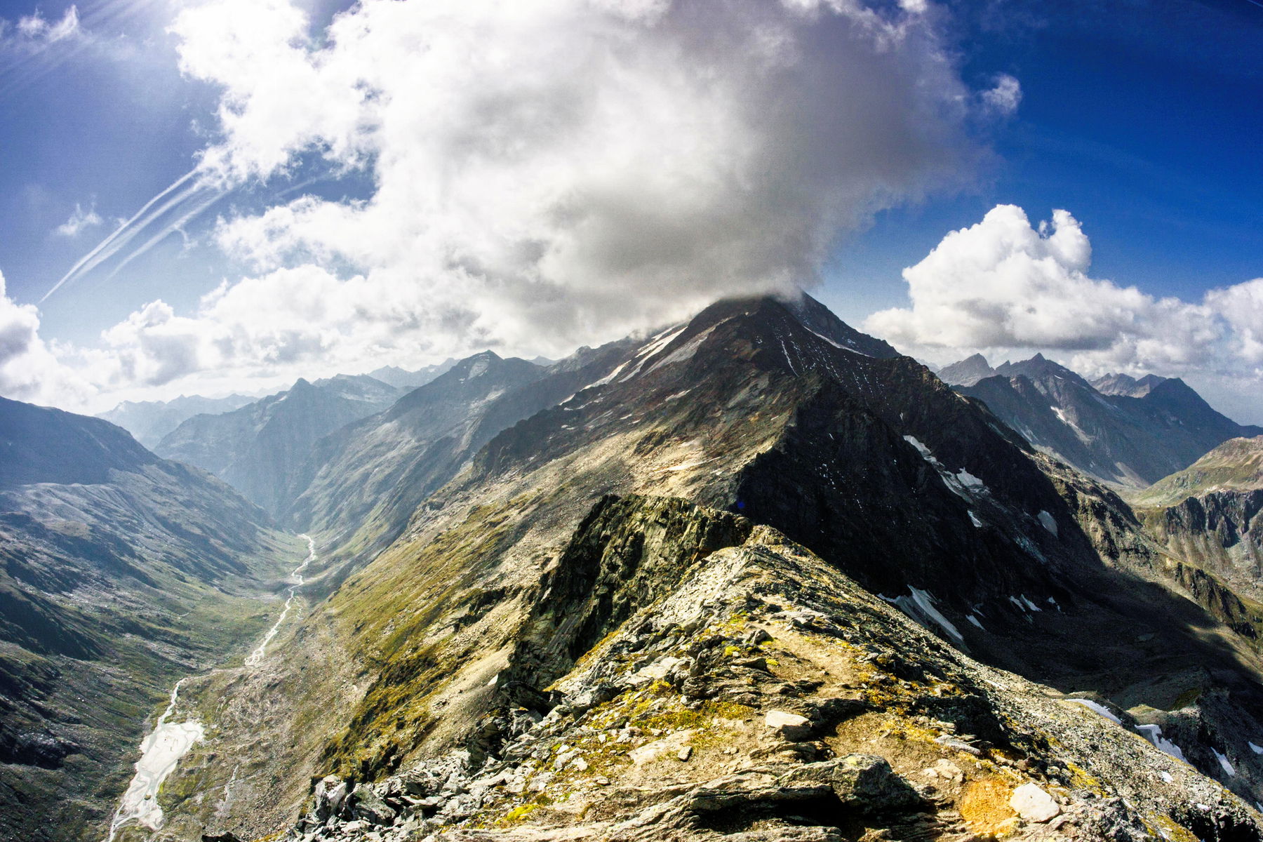 Von hier führt der Weg steil hinab zur Kleinen-Philipp-Reuter-Hütte und weiter ins wasserreiche Umbaltal, voller Bachquerungen und Furten.