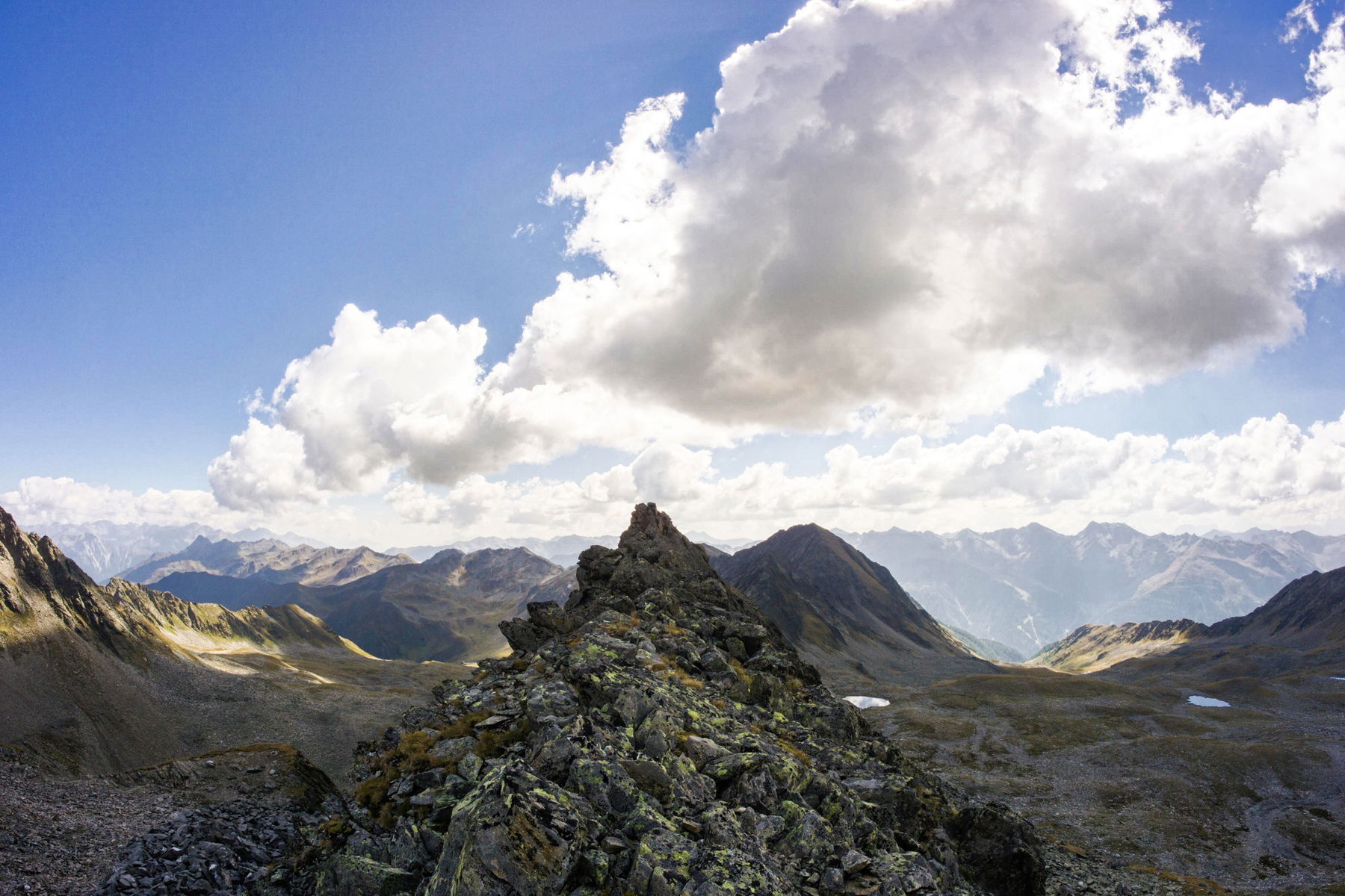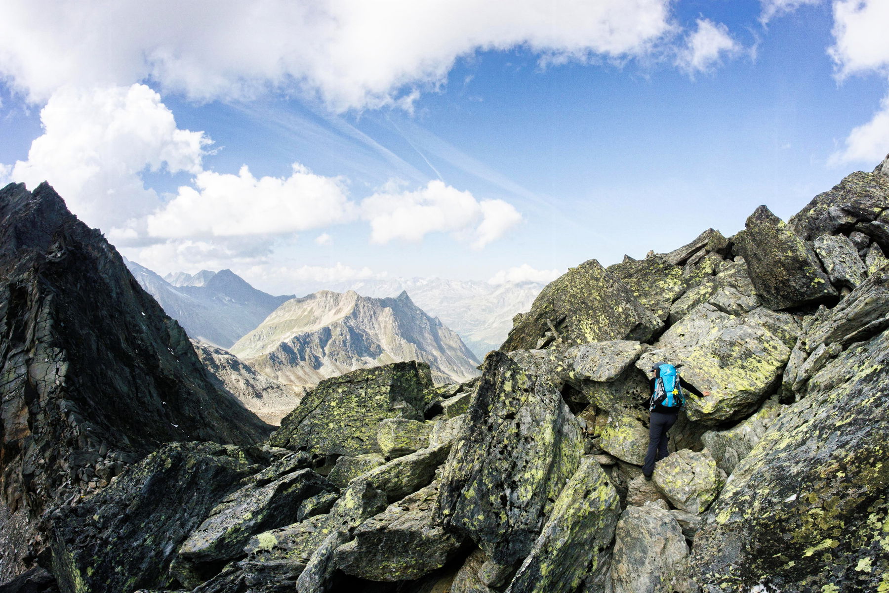 Vom Gipfel folgen wir den Markierungen zurück zum vorderen Umbaltörl, das wir nach kurzer und einfacher Blockkletterei erreichen.