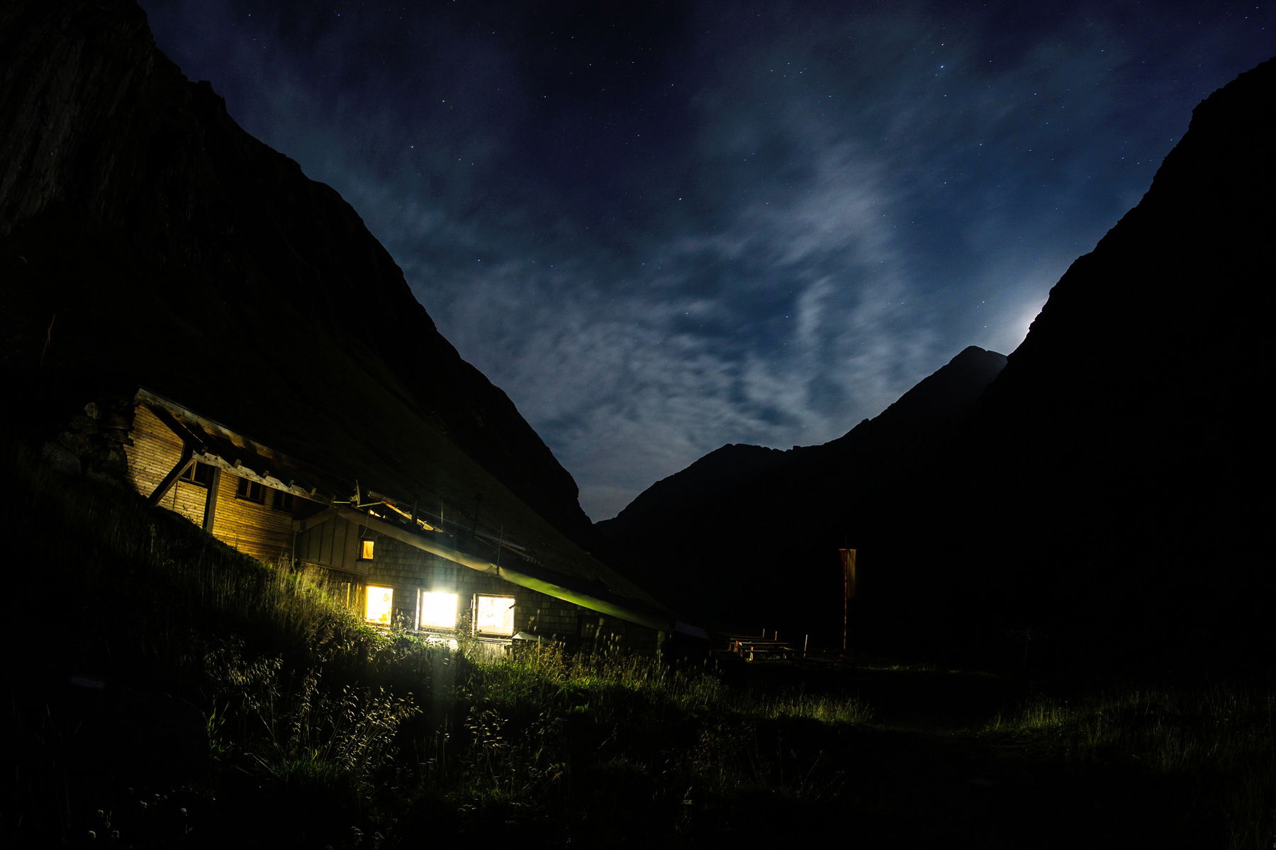 Da wir Ende September und unter der Woche unterwegs waren, waren die Hütten erstaunlich leer. Nach dem Abendessen lichtet sich dann sogar noch die Wolkendecke und gibt wunderschöne Blicke auf die Milchstraße frei. Es hilft natürlich gewaltig, dass die einzige Lichtquelle weit und breit die Hütte selbst ist.