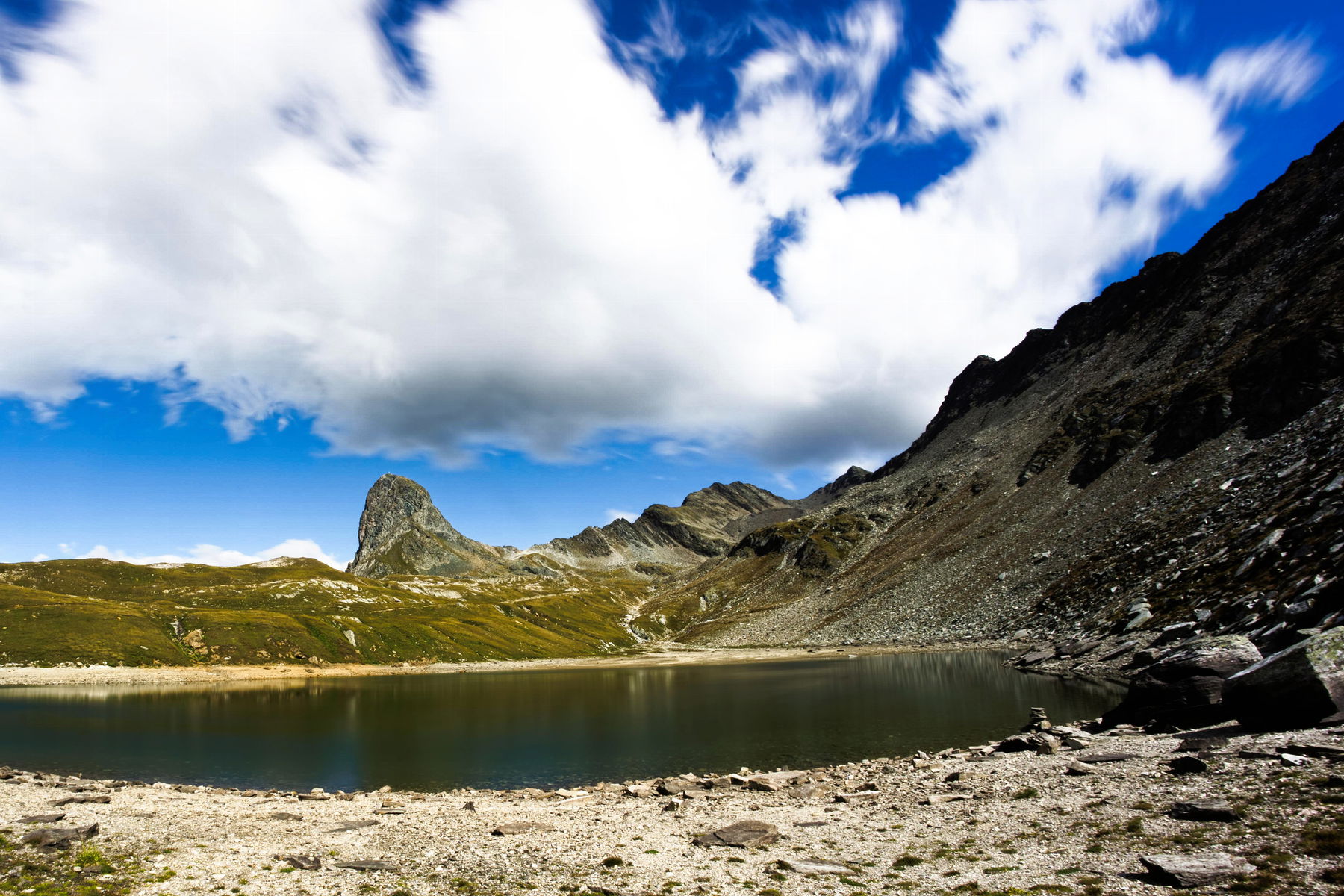 Tags darauf führt uns der Weiterweg zuerst entlang des Bödensees, dann hinauf auf die Rote Lenke und wieder hinab zum Kleinbachboden. Im stetigen Auf und Ab wandern wir zum Mittagskögele und weiter aufwärts zum Prägrater Törl, dem höchsten Punkt des heutigen Tages.