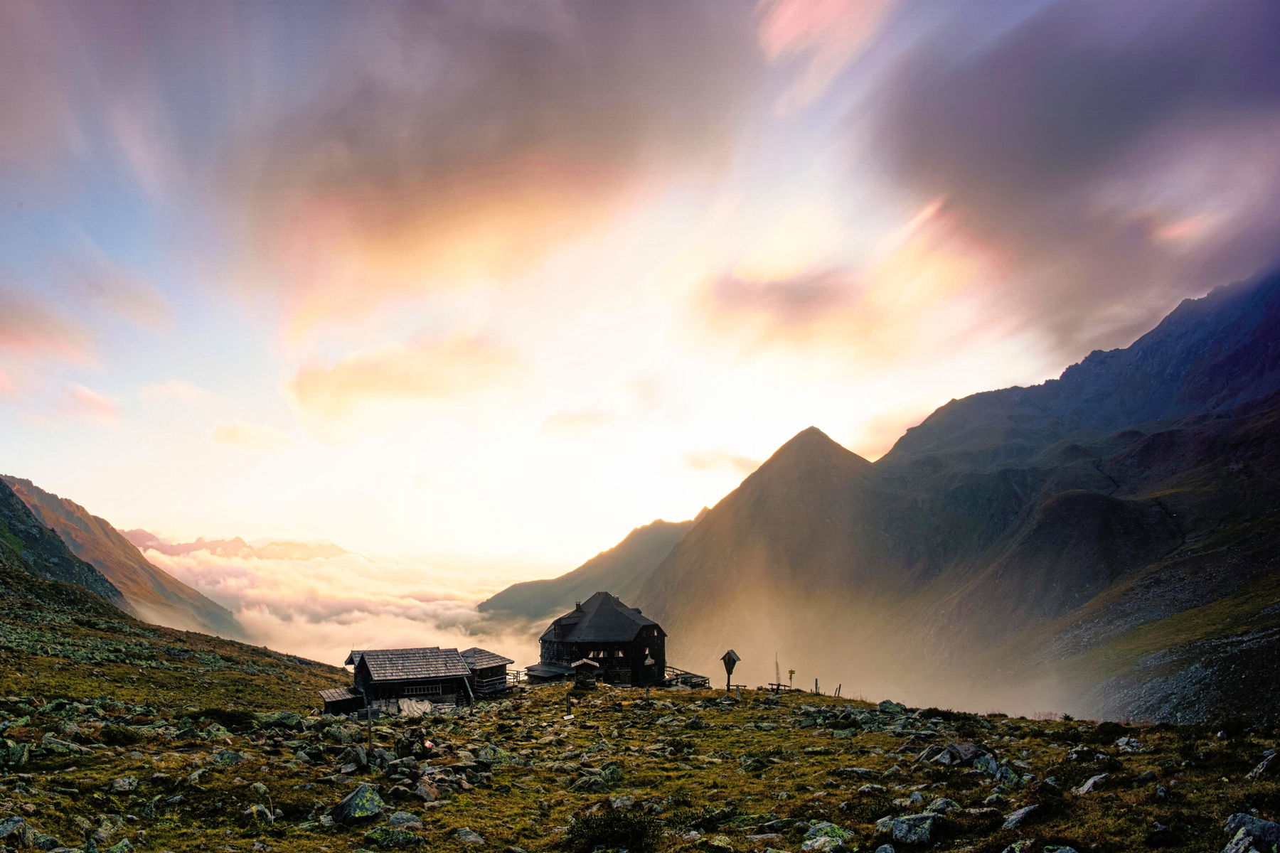 Die Hütte liegt westlich der Rötspitze, wunderschön am Beginn des Wind- und Röttales.