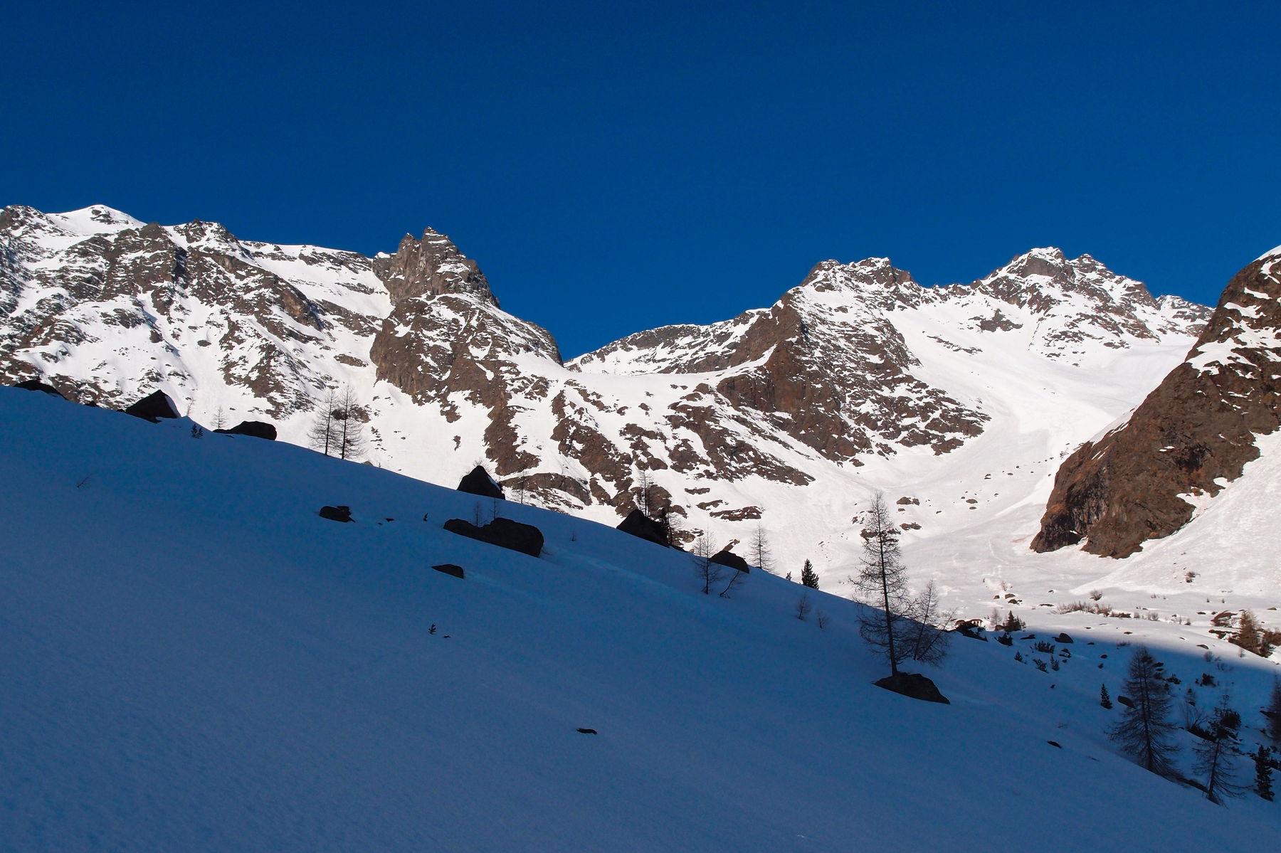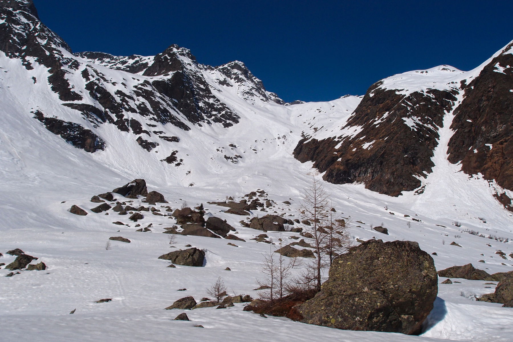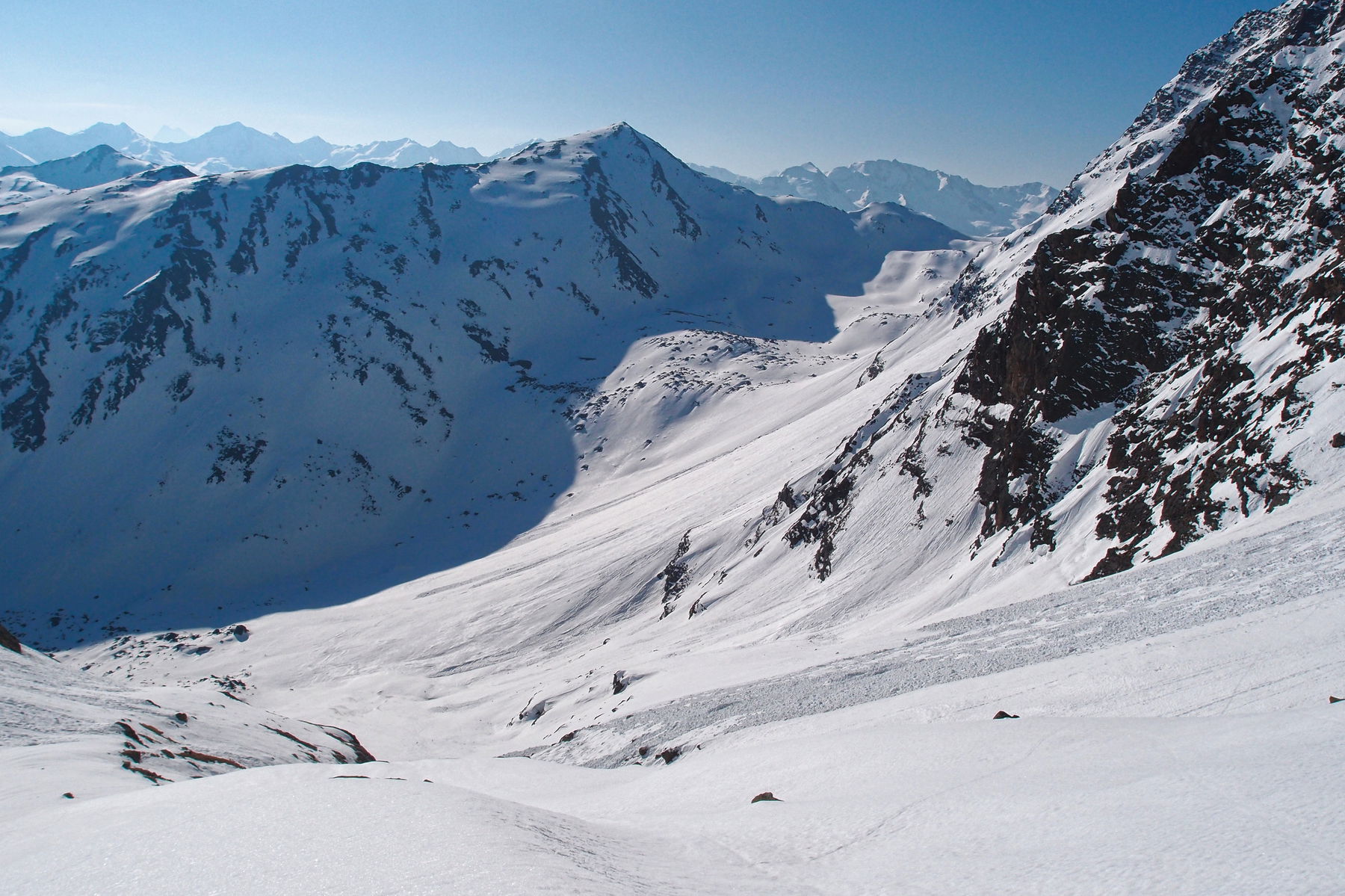 Hier zweigen wir nach Westen Richtung Flirscher Ferner ab. Je nach Schneelage durchquert man die anfängliche Blockhalde nach Süden ausholend oder direkt. Lawinentechnisch folgt nun die Schlüsselstelle der Tour. Für 300 hm befindet man sich nun im bis um die 35° steilen Gelände, wobei es sich um große Hänge mit teils steilen Seitenbegrenzungen handelt. Die Spuranlage wird sich nach den konkret herrschenden Verhältnissen richten.