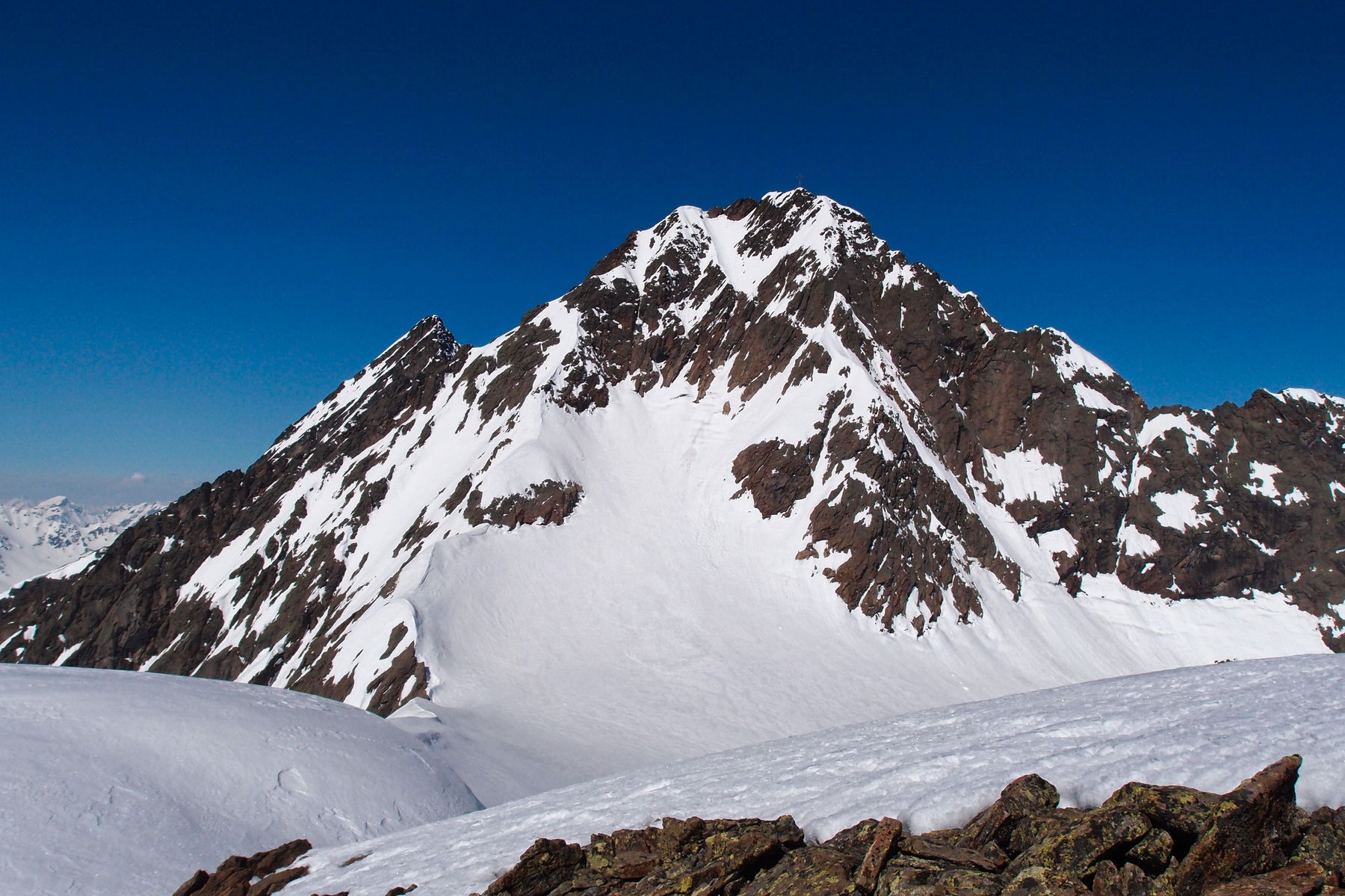 So können die Spalten bestmöglich umgangen werden und man bewegt sich immer im flachen Gelände. Ab 2900 m schwenkt man nach Osten auf den Grat mit markanter Erhebung zu. Je nach Schneelage mit Ski oder zu Fuß die letzten Meter unschwer am Rücken zum höchsten Punkt.